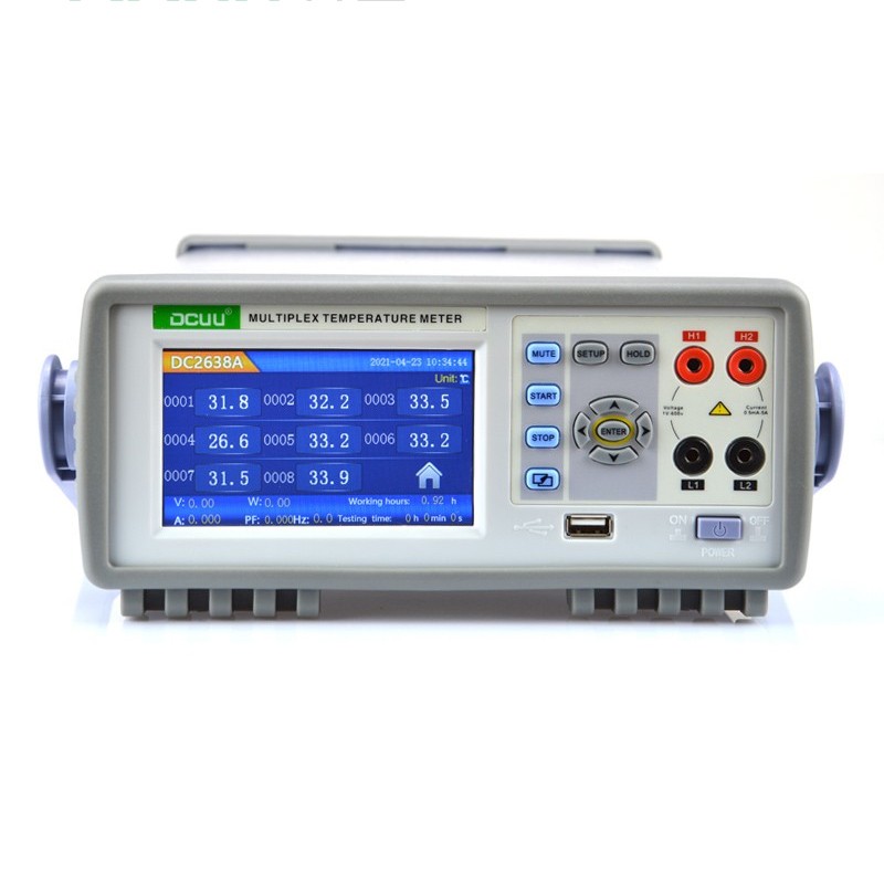 产品概述 DC2638系列多路温度巡检仪是一款适用于多点温度测试和实时监控跟踪的仪表。具备测量方便、精度高、热电偶测试点可重复利用的优点。可设定各通道上下限温度限值报警,DC2638系列多路温度巡检仪具备U盘存储功能,配备USB通讯和专用软件,便于实时监控分析以及记录保存。 产品特点 技术指标 型号 | DC2638A | DC2638B | 屏幕尺寸 | 4.3寸液晶彩屏 | 通道数 | 8通道 | 16通道 | 测量显示 | 实时数值、曲线图、电参数(电压、电流、功率、功率因数) | 分辨率 | 0.1℃ | 带电测试 | RMS 500V、VP 1000V | 继电器类型 | 机械继电器(有声) | 采样时间 | 0.3秒 ~ 5秒 | 存储方式 | U盘存储(U盘格式:文件系统FAT32,分配单元大小4096KB) | 曲线间隔 | 1秒~125秒 | 测温范围 | -100℃~1200℃(根据不同的热电偶而定) | 热电偶类型 | 支持K型、T型、J型热电偶 标配K型热电偶:-20℃~250℃(表皮耐温200℃) | 分选设定 | 支持单通道或全通道统一设定 | 定检 | 支持 | 冷端补偿 | ±0.5℃ | 通讯接口 | B型USB接口(可定制RS-232、RS-485接口) | 标配软件 | 温度巡检系统 | 尺寸(宽×高×深) | 255mm(宽) ×105mm(高) ×380mm(深),机柜开口尺寸(不含面框、提手):215mm(宽) ×88mm(高) | 供电电源 | 110V~250V,频率50Hz/60Hz |