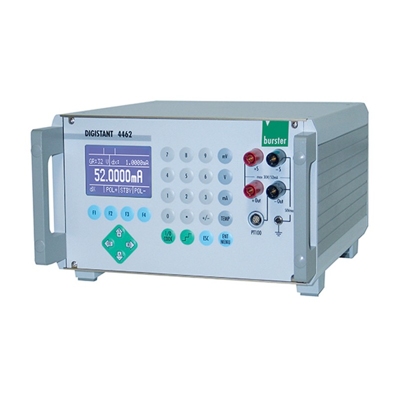 4462高精度电压、电流、热电偶校准源 用于电压,电流和热电偶的高精度校准源DIGISTANT®,用于精确测试和校准以及过程控制,基本精度为0.005%,RS232和IEEE488接口 精密校准单元结合了高精度,低漂移,低噪声和**的长期稳定性以及多种功能和简单的操作。斜坡,Δ+ /Δ-和多个设定值存储使用户更容易操作设备。 因此,应用可能性很多: 校准电流表和直流电压表 热电偶温度测量仪器的精确测试 校准控制器,传感器,检测设备和过程控制中使用的其他设备 借助集成的斜坡功能进行开环过程控制 DIGISTANT®4462型既可以用作独立的台式设备,也可以用于自动的计算机辅助制造和测试系统。 可以设置±200 nA ...±52 mA的电流,±1μV...±30 V的电压以及14种热电偶类型的温度设定值。 输出值通过传感器线路反馈,以消除测量导线两端的电压降。该设备具有可调的电流/电压限制。内部可使用一个外部分压器(最高为1:1000)。 使用热电压源选项,您可以输入°C,°F和K,ITS 90或IPTS 68温度标度以及比较点模式恒定/外部。此外,在采购热电偶时,可以使用校准的外部比较点,从而可以考虑设备中用于校准的数据。 在发光的图形LCD上以12毫米的大图形显示源值。 该设备既可以通过键盘也可以通过接口进行操作。 产品特点 高精度电流和电压源±52 mA,±30 V 选项:±22 mA,±60 V 所有常规热电偶类型的精确仿真(可选配) 误差极限0.003%Rdg。 标配RS232和IEEE488接口,USB和以太网(可选配) 当前的“ SINK” 技术参数