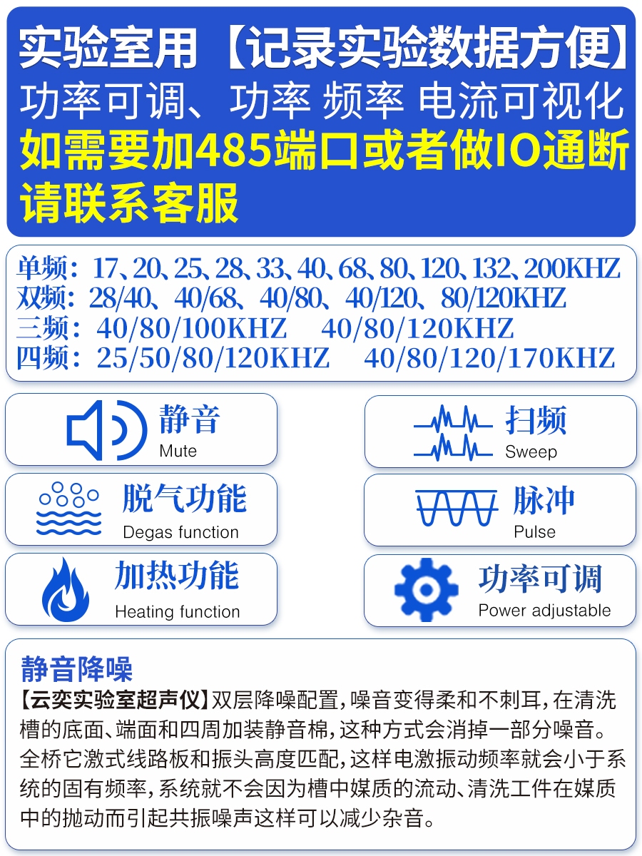 目前各种科研实验室都离不开超声波清洗机,也可以说超声波清洗机的振荡功能成了实验必不可少的一个重要环节,但是实验千千万,超声波清洗机的频率也是各有特点和优势,针对不同的实验如何选择合适的频率和功率呢? 超声波清洗机**是一个神奇的存在,越深入了解就越发现你对它知之甚少,针对不同的实验选择不同的频率是我当了几年销售之后的经验之谈和更多学习了解之后的笃定。 首先超声波清洗机的频率分低高频,28-40Khz属于低频,68-120Khz属于高频 低频的特点是:空化气泡半径较大,崩塌时产生的力度也大,但不够均匀,所以低频段适合用于分散固体大颗粒或者清洗大表面工件(硬度高,污物颗粒大),俗称的“粗洗”,缺点就是不易穿透深孔和表面形状比较复杂的部件。 高频的特点是:频率越高,空化阈值越高也就代表着空化所需的声强越大,同样的溶液内部空化气泡形成的就越细密和均匀。所以简单解释就是高频段的清洗机振力相对“温和”,噪声更小更细腻,空化气泡密集均匀,声场均匀,穿透性强,适合分散微米级纳米级的颗粒, 尤其是针对一些高精度要求,肉眼不可见到的一些反应实验,高频是最合适的,实验室最常用的高频就是120Khz,对于清洗来讲高频的优势也很明显,高穿透性可以轻易钻入形状复杂零件的狭缝、深孔、盲孔中进行无刷清洗。所以高频也经常用于清洗电镀表层、光学镜片、铝镜、低档的液晶器件、光纤玻璃丝上的微小颗粒等等 实验室选品超声波清洗机时,务必要和商家沟通好是用于什么样的具体实验,选对频率直接关系到实验的最终结果,95%以上的实验室一般选择10L的清洗机,云奕YL0810-40是最常用的实验室超声波清洗机,多数用于实验器皿的清洗和一些普通的小实验。而云奕双频实验室超声波清洗机YL0810-40120也是众多实验室的**,低频+高频(40khz+120khz)可以解决多数的清洗和实验问题。 |