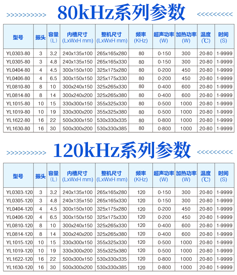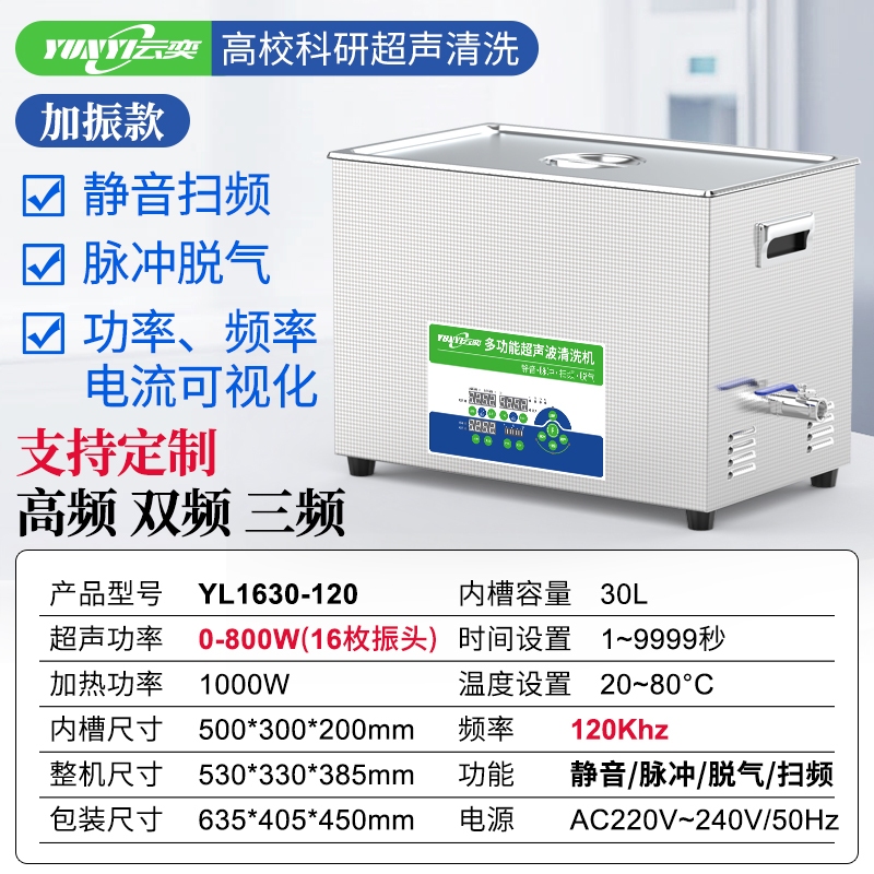 功能:静音、扫频、脉冲、脱气、加热、功率 频率 电流可视化、功率可调 1.型号:YL1630-120(数码按键款/底振式) 2.内槽尺寸:长500mm*宽300mm*高200 mm; 3.外型尺寸:长530mm*宽330mm*高385 mm; 4.超声波额定功率:0-800W(安装16个50W振头)加振款 5.超声波额定频率:120kHz 6.加热额定功率:1000W 7.温度控制:数码显示控制(常温-80°C可设置) 8.时间控制:数码显示控制,精确到秒(1-9999秒可设置) 9.容量约:30L(4分排水阀) 10.清洗机内槽采用T1.5mm厚优质不锈钢材质冲压成形、无缝焊接,外壳采用防指纹不锈钢板包装,美观耐用,整机304不锈钢(包括内槽、壳体、阀体、管路); 11.电源要求:AC220V 50HZ 12.标配不锈钢清洗篮、不锈钢防尘盖、电源线等等