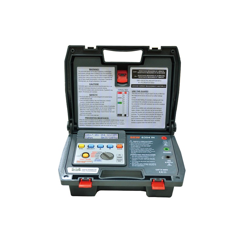 产品特点 ●2行×16字符LCD显示 ●微处理器控制 ●绝缘电阻测试可到10TΩ ●4种绝缘测试电压:500V,1000V,2500V,5000V ●交流/直流电压量测(30~600V) ●短路电流可到1.9mA ●PI显示(极化指数) ●DAR显示(介电质吸收比) ●自动换档 ●数据传输功能 ●外部电压存在警示(≥30Vac或≥30Vdc) ●自动锁定读值功能 ●过载保护 ●可调整测试时间1~30分钟 ●内建内存数据储存 ●显示绝缘量测时间 ●自动关机功能 ●可储存200笔量测值,并可于显示器上读取 ●电源:1.5V"C"碱性电池×8 技术参数 测试电压 | 500V,1000V,2500V,5000V | 绝缘电阻 | 1TΩ/500V 2TΩ/1000V 5TΩ/2500V 10TΩ/5000V | 准确度 | 0~100GΩ/500V 0~200GΩ/1000V 0~500GΩ/2500V 0~1000GΩ/5000V | ±(5%rdg+5dgt) | 100G~1TΩ/500V 200G~2TΩ/1000V 500G~5TΩ/2500V 1000G~10TΩ/5000V | ±12%rdg | 分辨率 | 1000MΩ:1MΩ 10GΩ:0.01GΩ 100GΩ:0.1GΩ 1TΩ:1GΩ 10TΩ:10GΩ | 短路电流 | 可达到1.9mA | PI(极化指数) | V | DAR(电介质吸收比) | V | 交直流电压量测 | 交流电压:30~600V(50/60Hz) 直流电压:30~600V 准确度:±(2.0%rdg+3dgt) 分辨率:1V | 电流量测 | 0.5nA~0.55mA(依据绝缘电阻值) | 电源 | 1.5V"C"×8碱性电池 | 尺寸 | 330(长)×260(宽)×160(高)公厘 | 重量 | 大约4268g(包含电池) | 安全规范 | EN61010-1CATIV600V EN61010-2-030 EN61326-1 |