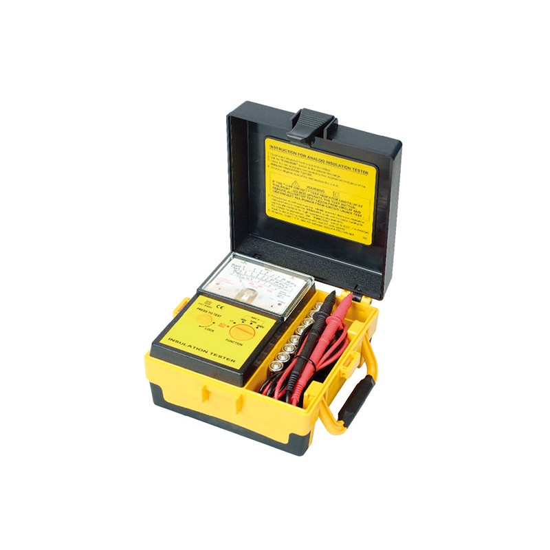 产品特点 ●供电信相关设备检测用。 ●吊线式高质量防震表头。 ●可量测绝缘阻抗(MΩ)、导通测试(Ω)和交流电压(ACV)。 ●有三文件量测电压:50V、125V、250V。 ●彩色刻度板,容易识读。 ●电容性电压自动放电。 ●可作长时间量测 ●外来电压警示功能(LED) ●具有检查电源功能(LED) ●有保险丝保护设计 ●通过欧洲安规验证符合。EN61010-1CATⅢ600V、EN61326-1 技术参数