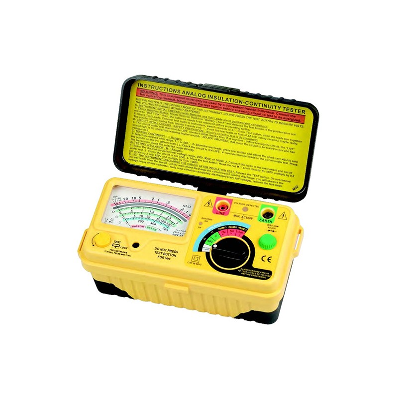 产品特点 ●吊线式高质量防震表头。 ●绝缘阻抗三文件量测电压:250V、500V、1000V。 ●两档导通测试:0-3Ω:供低阻抗量测、0-500Ω ●绝缘阻抗量测推动电流大于1mA ●外来电压红色灯(LED)警示 ●关机后自动放电 ●检查电池电量功能设计 ●电池能量消耗量低 ●彩色刻度板有反射镜设计便于识读 ●使用测试旋钮可作长时间量测 ●保险丝保护设计 ●符合IEC61010-1CATⅢ600V、EN61326-1 ●符合英国第16版本(BS16th)