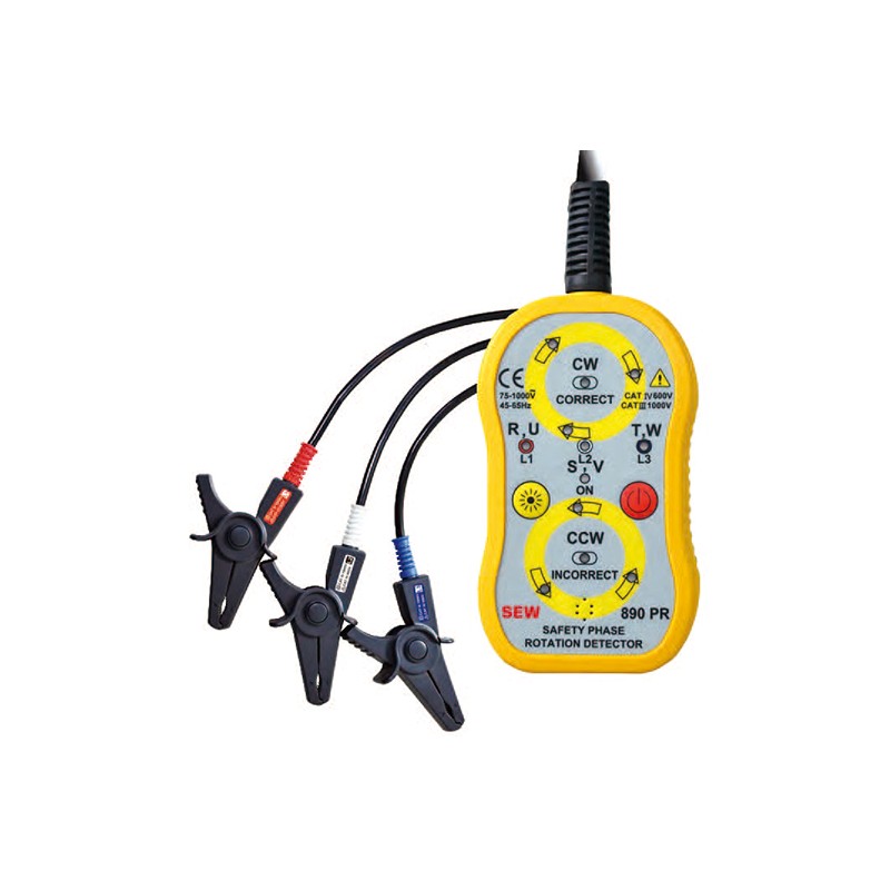 产品特点 ●890PR是非接触式量测的检相计,它藉由LED的显示和蜂鸣器的声音,来查验三相交流电压系统的状况。 ●具有检测相位和相序的双重功能。 ●自动关机功能(约五分钟)。 ●鳄鱼夹上有颜色贴纸区分,由于采用不接触裸铜检测,只要将鳄鱼夹夹住电源线外部即可检测,因此安全度高。 ●具有超亮设计,可在强光下或昏暗处辨识检测状况。 ●仪表背面附有四颗强力磁铁,可悬挂于配电箱外壳,方便操作人员使用。 ●应用电压及频率宽广,分别为75V~1000V交流电压45~65Hz。 ●鳄鱼夹量测口径:最大33mm。 ●通过欧洲安全规范验证:EN61010-1CATⅢ1000V/CATⅣ600V、EN61326-1EN61557-1EN61557-7 技术参数