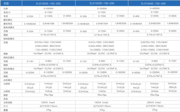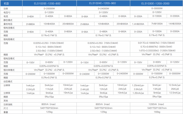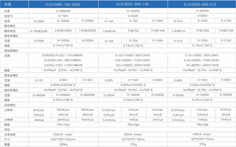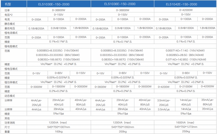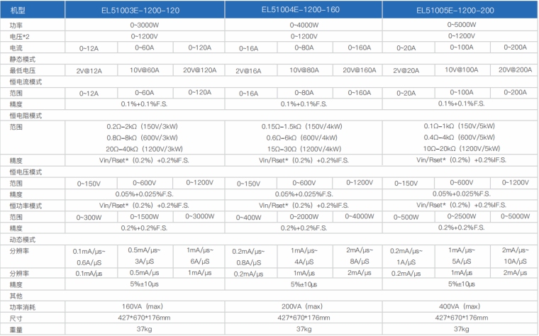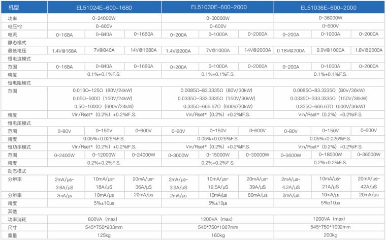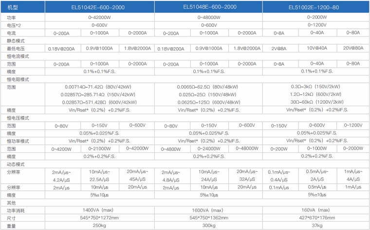 EL51000E系列大功率电子负载有150V、600V、1200V三种电压范围,功率范围由2kW至48kW、单一台的最大电流可达2000A;通过并联扩展,最大功率更可达240kW。 EL51000E系列负载具有高功率密度、高控制和测量精度、高性价比“三高”特点;同时本系列负载具备同步动态,并联扩展等功能,更有瞬间提供三倍额定功率功能,EL51000E系列负载支持恒电压CV、恒电流CC、恒电阻CR、恒功率CP四种传统静态加载模式,更支持恒电压CV+恒电流CC、恒电阻CR+恒电流CC、恒电压CV+恒电阻CR三种复合加载模式。 产品主要是供服务器电源、A/D电源供应器、功率电子元件、动力电池、车载充电机OBC/DD模块、直流充电桩模块、直流充电桩、电流器件(继电器、保险丝、连接器)等产品测试使用。广泛应用于电源供应器、动力电池、新能源汽车、直流充电桩、民用航空、科研院校等多种领域,是专用模拟各类高功率产品负载变化的高精度仪器。 产品特点 1.高速动态负载,最高频率达 50kHz 负载波形模拟功能 2.电压范围 : 150V、600V、1200V 3.电流范围:最高达2000A 4.低压带载特性:0.5V 即可加载电流 5.主/从并联控制,并联数量高达10台 6.使用者自订波形(UDW) 7.高达50kHZ的自动变频动态扫描(Sweep) 8.即时的电源供应器负载暂态响应模拟及电压峰值(Vpk+/-)量测 9.瞬间过功率拉载功能 10.短路模拟功能 11.可透过前面板直接编程255组时序 12.电池放电模拟和量测放电时间功能 13.快速 OCP 测试功能可编程切换多组负载 14.高精度电压、电流和功率量测 15.ARM 控制技术,通讯速度快 16.具有过压、过流、过功率、过温度、反向保护功能 17.配备RS232通讯接口,可选配RS485/GPIB/LAN/CAN通讯接口 18.环境温度:-20℃-40°C 19.智能风扇控制 产品应用 提供四种静态加载模式:恒电流模式(CC)和恒电阻模式(CR)适用于传统开关电源负载仿真,恒电压模式(CV)适用于电池充电机及恒流输出电源负载仿真,恒功率模式(CP)可作为动力电池组和储能装置负载的模拟。