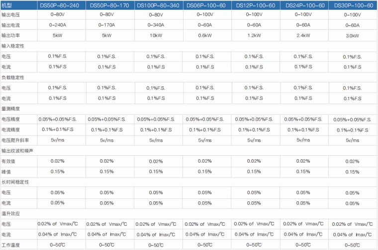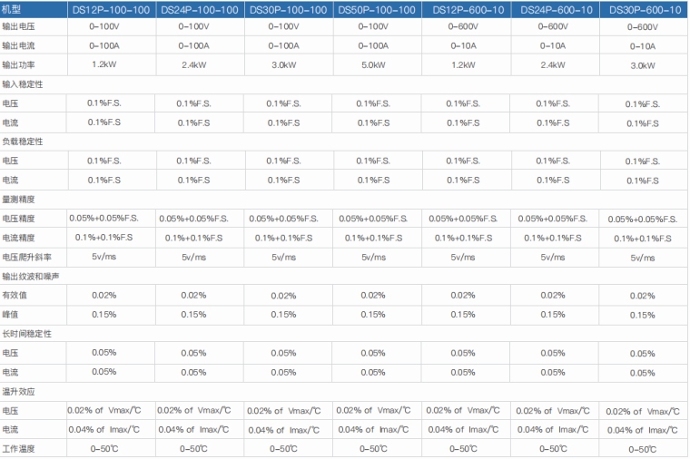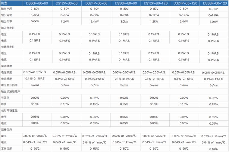 程控直流电源是一款具备输出高精度电压/电流的电源产品,同时,具备高精度测量功能。该系列可最大限度满足高压小电流/低压大电流等不同产品的测试需求,搭配RS-232(标配)/GPIB/RS485/ CAN/ LAN 通讯接口,可用于ATE集成,远程电压补偿电路可让输出更加精准。 产品特点 1.定功率架构,电压/电流输出范围更广 2.小体积、大功率电源:2-4U高度,标准机柜宽度 3.电压0-600V;电流0-340A,多型号选择 4.输入PFC功率修正设计,功率因素>0.95 5.可并联多台电源,以获得更大功率 6.可编程模拟特殊电压变化波形 7.远程电压补偿(Remote Sense) 8.完善保护功能:过压、限流、过温 9.全彩色LCD屏、数字键盘,操作更方便 10.ARM控制技术,优化指令格式,通讯速度快 11.RS232(标配)/GPIB/RS485/CAN/LAN通讯端口 技术参数