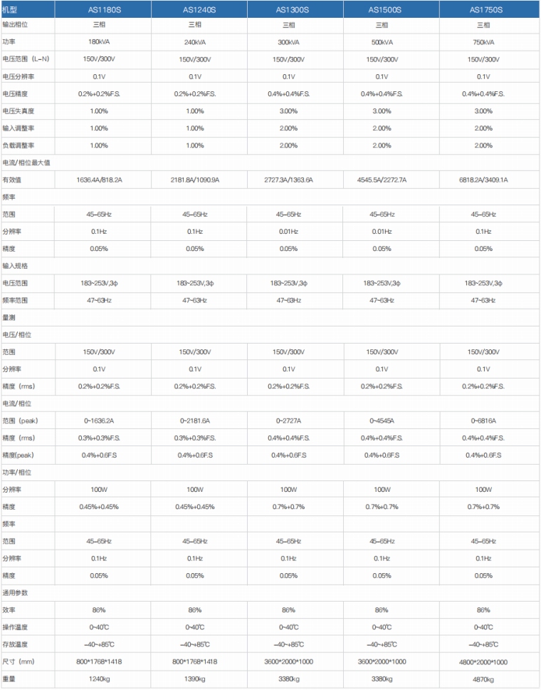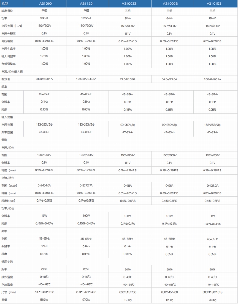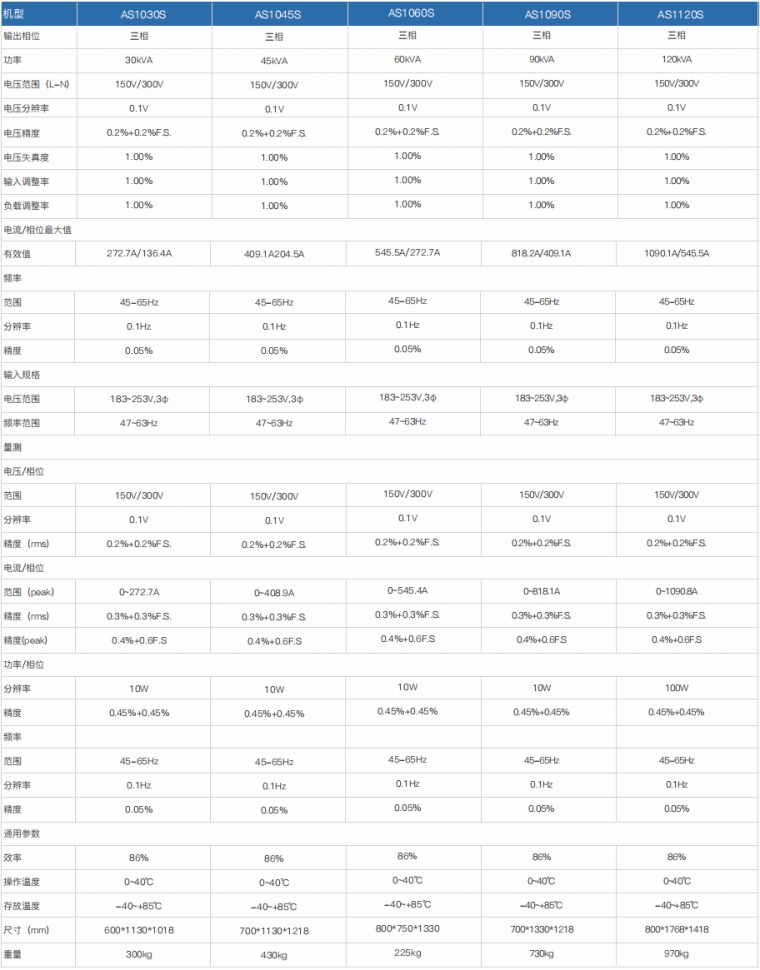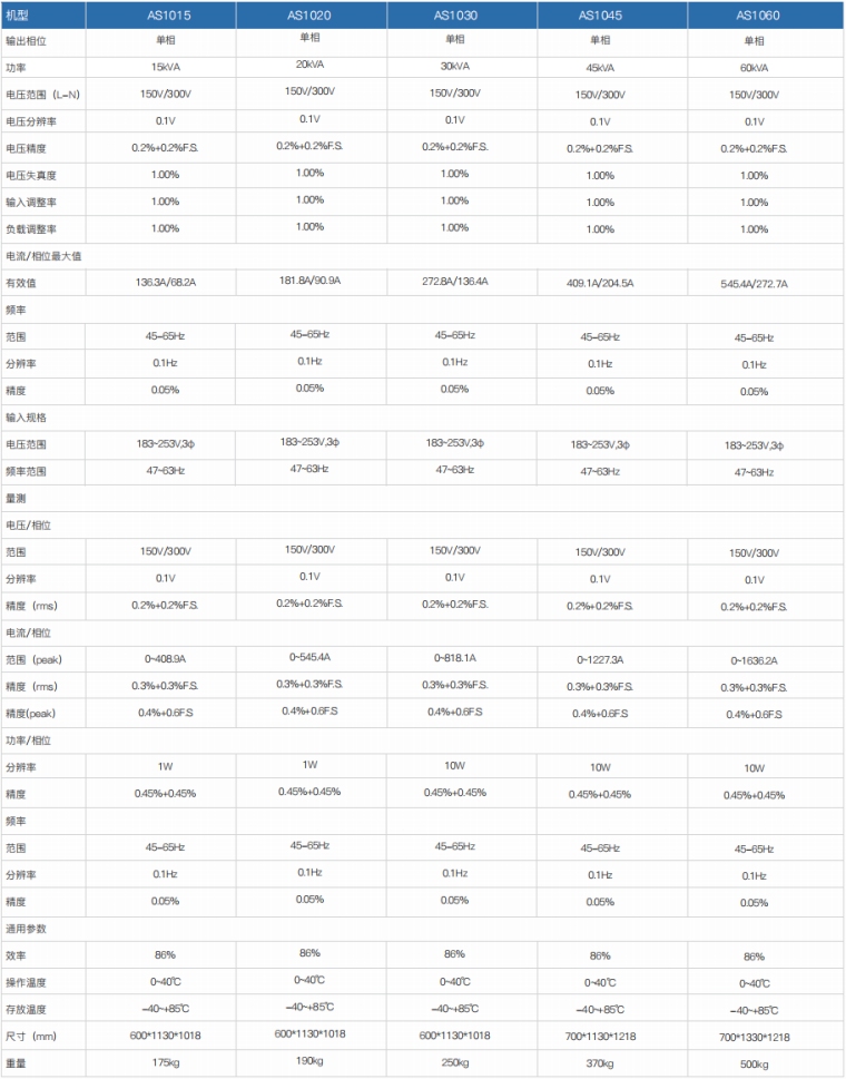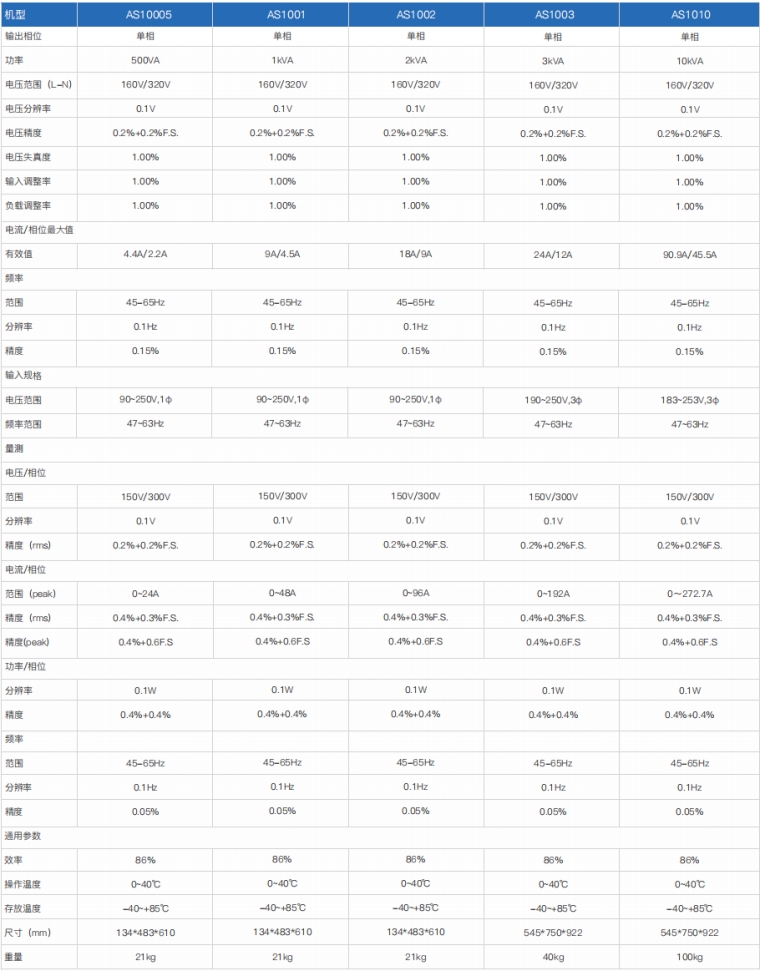 程控交流电源-AS1000/AS1000S是一款经济、高稳定性的交流变频电源,采用数字化技术、控制精确可以输出非常纯净、谐波成分小的正弦交流波形。 本款电源的电压输出范围0-300V,频率范围宽,适合作为国内所有工频输入的电子产品测试输入源。全面的保护机制让用户使用起来更加安全。可选配RS232或RS485通讯接口,让本产品可整合用于各种测试系统。 产品特点 1.在线监测功能:输出状态下监控IGBT温度,变压器温度,风机转速、输入电压等参数 2.3倍额定电流冲击承受2S,可直接启动等同于1/3电源功率的冲击型负载 3.电压分档功能:150V档、300V档自动调整或锁定1-300V 4.采用FPGA数字化技术、控制精确,保证输出高质量的正弦波形 5.黑匣子功能:自动记录报警时的电源状态、报警代码 6.输出状态下调节电压及频率 7.测量功能:电压、电流、频率、有功功率 8.风机转速根据温度自动调整,降低噪音 9.具有过压、过流、过温度,过功率,风扇保护功能 10.多组快捷组、掉电记忆功能、快捷键和旋钮操作 11.lock键,人性化设计,5分钟不操作自动锁定,防止误操作 12.配备RS232通讯接口,可选配RS485/GPIB/LAN/CAN通讯接口 技术参数