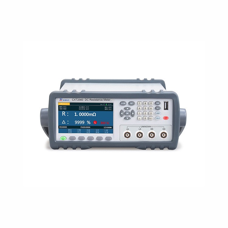 CXT2560 工业精密直流电阻测试仪 CXT2560工业精密直流电阻测试仪基本精度0.02%,可测范围0.1μΩ-10MΩ。具有高速的测试线连接异常检测功能和极短的测量周期, 测试速度可达6ms/次。脉冲测试功能使仪器可精确测量微弱电阻。本仪器可设置10档比较上下限,并具有USB,232,HANDLER,U盘等多种接口,适合于各种信号接口的自动生产线。 适用范围 CXT2560工业精密电阻测试仪可在工业场合测量各种高、中、低值电阻器;电线电缆、分流器、各种开关接触电阻;接插件接触电阻;继电器线包和触点电阻;变压器、电感器、电机、偏转线圈绕线电阻;导线电阻;车、船、飞机的金属铆接电阻;印制板线条和孔化电阻等。实现了自动化系统中所要求的高速度、高精度和高抗干扰性测试。 测试范围0.1uΩ-100MΩ;最大测试电流1A;抗干扰性强;测试速度100次/秒;标配232/485/USB/HANDLER接口 产品性能特点