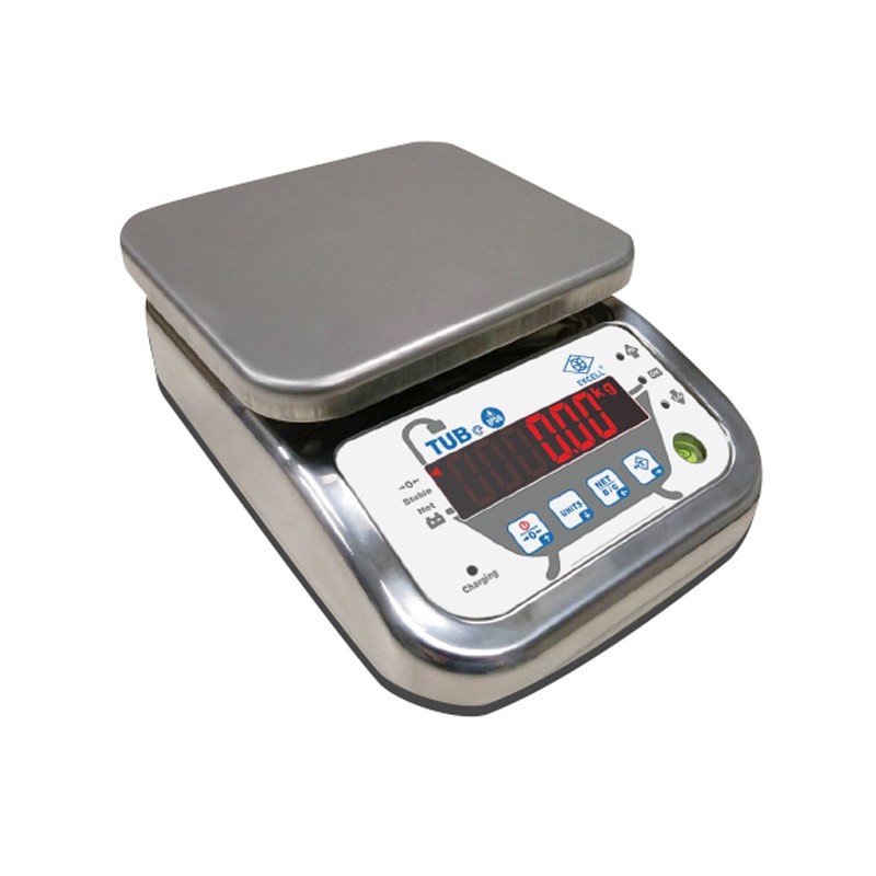 TUB /TUBe IP56 304不锈钢防水计重桌秤 采用24bits AD,内部分辨率可达60万 (1)从加载起到达稳定所需时间短 (2)从负载移除起到达零点之速度快 (3)零点、扣重键启动之反应速度快 采用 304 不锈钢机壳,秤量食品更安全卫生。 秤盘固定锁附螺丝可提升秤盘稳定程度。 工业级抗干扰能力(EMS+EMI):抗辐射、静电、电源输入干扰效能设计。 *省电设计-LCD屏幕新增背光显示多段亮度调整功能,LED面板增加OK检校警示灯,不只好操作更能节省电力。 *容易清理-坚固耐用、完全密封,平滑好清理的底部设计让您能轻松保持电子秤于良好状态。 *防水防潮-下盖由螺丝密合,垫高秤盘让水与食物不容进入秤中,更方便维护 经SGS认证防水等级IP56, 适用于严苛工业环境,防腐蚀,防水、防潮、防尘,抗冲击力强 整机自主研发生产,包括结构和电路、软件,性能稳定,质量可靠,且能提供便捷的售前与售后。 功能特点 TUB-LCD版 6 位数,字高25mm,白色 LED 背光。 TUBe-LED版 6 位数,字高21mm,红字数码管。 可选择的单位:公斤(kg)、克(g)、磅(lb)、台斤等秤量单位。 具有自动更正、自动零点追踪、双重之过载保护之功能。 可选择开机单位、地心引力值调整功能、外部重量校正功能。 具有定量警示及三点数位开关控制之功能。 按键采有触感之设计,采用3M背胶提升防水性及耐用性。 电源适配器DOE Level 6绿色能效。 产品图说明