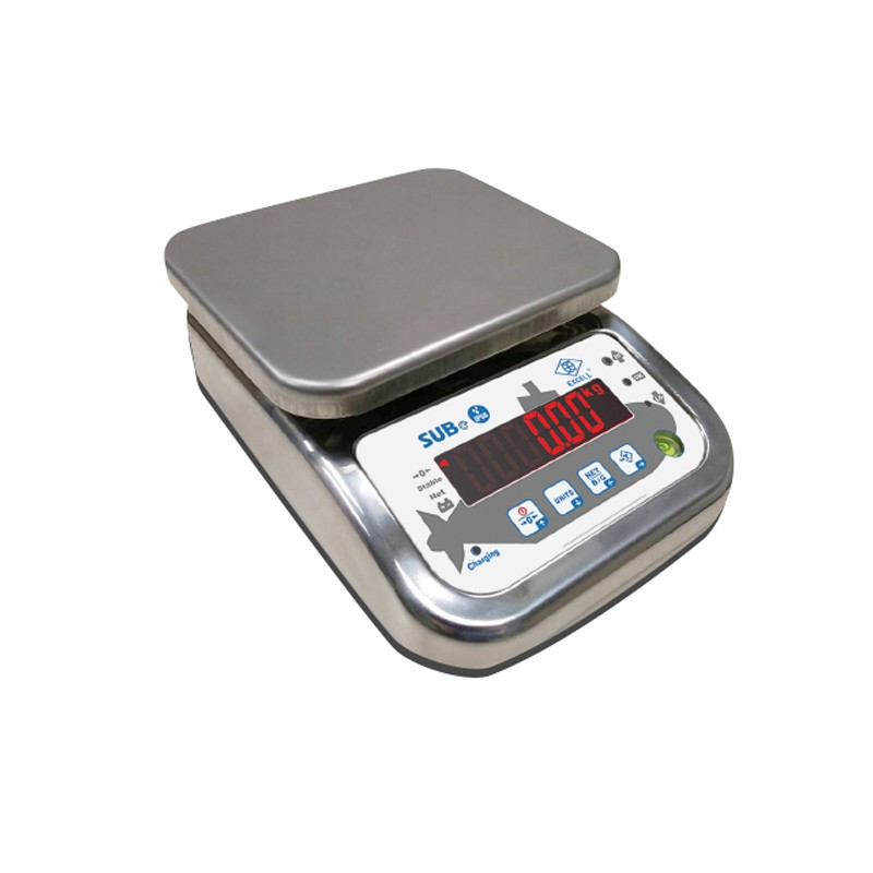SUB /SUBe IP68 304不锈钢防水计重桌秤 采用24bits AD,内部分辨率可达60万 (1)从加载起到达稳定所需时间短 (2)从负载移除起到达零点之速度快 (3)零点、扣重键启动之反应速度快 采用 304 不锈钢机壳,秤量食品更安全卫生。 秤盘固定锁附螺丝可提升秤盘稳定程度。 工业级抗干扰能力(EMS+EMI):抗辐射、静电、电源输入干扰效能设计。 *省电设计-LCD屏幕新增背光显示多段亮度调整功能,LED面板增加OK检校警示灯,不只好操作更能节省电力。 *容易清理-坚固耐用、完全密封,平滑好清理的底部设计让您能轻松保持电子秤于良好状态。 *防水防潮-下盖由螺丝密合,垫高秤盘让水与食物不容进入秤中,更方便维护 经SGS认证防水等级IP68, 适用于严苛工业环境,防腐蚀,防水、防潮、防尘,抗冲击力强 整机自主研发生产,包括结构和电路、软件,性能稳定,质量可靠,且能提供便捷的售前与售后。 功能特点 SUB-LCD版 6 位数,字高25mm,白色 LED 背光。 SUBe-LED版 6 位数,字高21mm,红字数码管。 可选择的单位:公斤(kg)、克(g)、磅(lb)、台斤等秤量单位。 具有自动更正、自动零点追踪、双重之过载保护之功能。 可选择开机单位、地心引力值调整功能、外部重量校正功能。 具有定量警示及三点数位开关控制之功能。 按键采有触感之设计,采用3M背胶提升防水性及耐用性。 电源适配器DOE Level 6绿色能效。 产品图说明