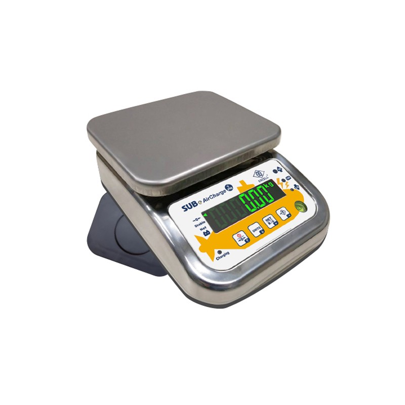 SUB Aircharge / SUBe Aircharge IP68 304不锈钢无线充电版 采用24bits AD,内部分辨率可达60万 (1)从加载起到达稳定所需时间短 (2)从负载移除起到达零点之速度快 (3)零点、扣重键启动之反应速度快 采用 304 不锈钢机壳,秤量食品更安全卫生。 秤盘固定锁附螺丝可提升秤盘稳定程度。 工业级抗干扰能力(EMS+EMI):抗辐射、静电、电源输入干扰效能设计。 经SGS认证防水等级IP68, 适用于严苛工业环境,防腐蚀,防水、防潮、防尘,抗冲击力强 整机自主研发生产,包括结构和电路、软件,性能稳定,质量可靠,且能提供便捷的售前与售后。 无线充电-采用无线充电技术,免除一般充电线接头可能因潮湿受损的缺点,同时让秤更容易摆放,使用起来更安全。 省电设计-LCD屏幕新增背光显示多段亮度调整功能,LED面板增加OK检校警示灯,不只好操作更能节省电力。 真正防水-产品接合处皆由密封的防水硅胶条阻隔水气渗入,螺丝锁下盖坚固耐用,平滑的底部设计容易清理 功能特点 SUB Aircharge-LCD版 6 位数,字高25mm,白色 LED 背光。 SUBe Aircharge-LED版 6 位数,字高21mm,红字数码管。 可选择的单位:公斤(kg)、克(g)、磅(lb)、台斤等秤量单位。 具有自动更正、自动零点追踪、双重之过载保护之功能。 可选择开机单位、地心引力值调整功能、外部重量校正功能。 具有定量警示及三点数位开关控制之功能。 按键采有触感之设计,采用3M背胶提升防水性及耐用性。 电源适配器DOE Level 6绿色能效。 产品图说明
