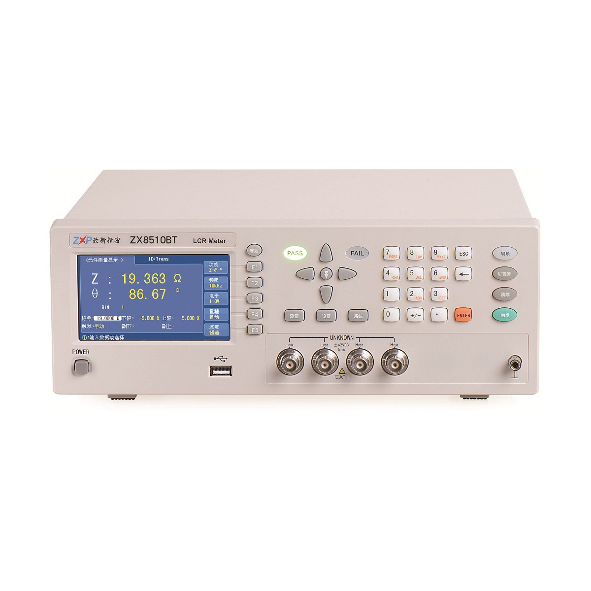ZX8510BT/ZX8517BT 简易数字电桥 概述 ZX8510BT/ZX8517BT型LCR数字电桥是一种高精度、宽测试范围的阻抗测量仪器,可方便升级替代*2810B/*2817B, 可方便选择测试频率,并可方便选择测试信号电平。可测量电感L、电容C、电阻R等多种参数。既能适应生产现场高速检验的需要, 又能满足实验室高精确度高稳定度的测量需要, 同时仪器所提供的 HANDLER及RS232C等多种接口为仪器使用于元件自动分选系统和与计算机联网通讯提供了条件。 订购信息 ●ZX8510BT:最高频率10KHz ●ZX8517BT:最高频率100KHz ZX8510BT/ZX8517BT 简易数字电桥 技术参数 型号 | ZX8510BT | ZX8517BT | 测试频率 | 100Hz,120Hz,1kHz,10kHz | 50Hz,60Hz,100Hz,120Hz,1kHz,10kHz,20kHz, 40kHz, 50kHz,100kHz, 共10点 | 测试参数 | L-Q,L-D,C-D,R-Q,|Z|-θ,|Z|-D | 测试电平 | 0.1Vrms, 0.3Vrms, 1Vrms | 基本准确度 | 0.1%,精度表为准 | 0.05%,精度表为准 | 显 示 范 围 | |Z|,R,X | 0.1 mΩ~99.999MΩ | 0.1 mΩ~99.999MΩ | L | 0.0001μH~999.99H | 0.0001μH~9999.9H | R | 0.01 mΩ~99.999MΩ | 0.1 mΩ~99.999MΩ | Q | 0.1~9999.9 | 0.1~9999.9 | C | 0.0001pF ~ 9999.9 F | 0.0001pF ~ 9999.9 F | 测试速度 | 快速:30次/秒、中速:6次/秒、慢速:1.5次/秒 | 信号源阻抗 | 30Ω、100Ω | 量程方式 | 自动、保持 | 触发方式 | 内部、手动、外部 | 校准功能 | 开路/短路、全频清零 | 等效电路 | 串联、并联 | 比较器 | BIN0~BIN3、NG、Pass、Fail | PASS、HI、LOW(PASS/FAILLED显示)、蜂鸣器提示 | 接口 | RS232C、UsbHost、USB Device、Handler | 温度湿度 | 0℃~40℃,相对湿度≤75% | 电源要求 | 100~120 Vac或198~242 Vac | 46~64 Hz,功率大于50 VA | 体积(WxHxD) | 310mmx110mmx315mm | 重量(净重) | 4.5Kg |