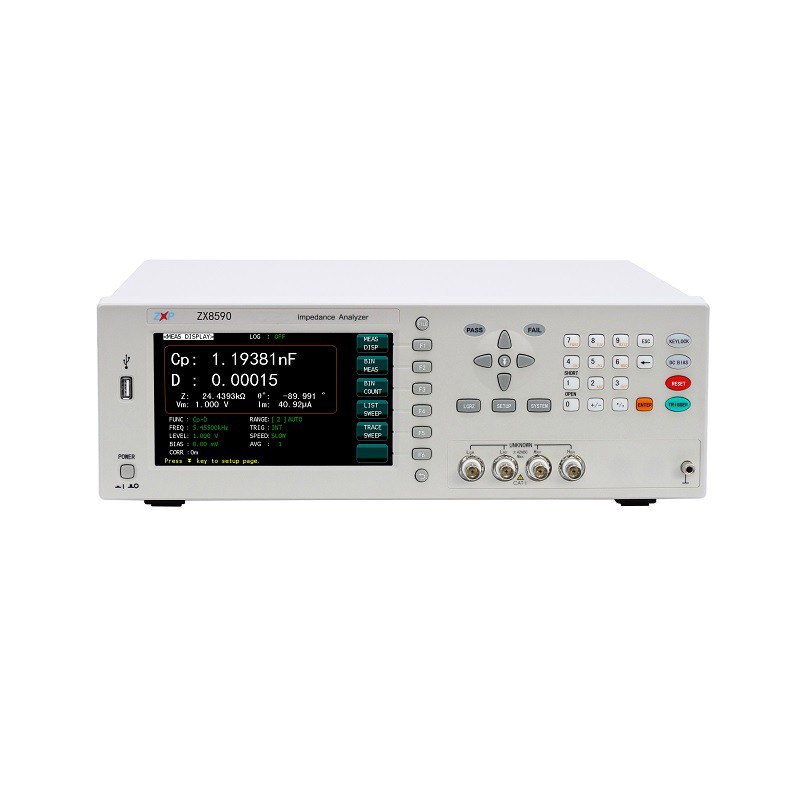 ZX8590 25MHz阻抗分析仪 概述 ZX8590系列高频精密阻抗分析仪:使用自动平衡电桥技术及四端对开尔文测试端、测量频率范围涵盖20Hz~25MHz,最小分辨率1mHz,基本测量精度可达0.05%。 ZX8590同时具有阻抗分析仪的绘图功能和LCR表测量功能,其高精度、宽频率范围可以满足元件与材料大部分低压参数的测量要求,可广泛应用于诸如电感器、电容器、电阻器、传声器、谐振器、液晶显示器、变容二极管、变压器等进行阻抗性能的研究分析及生产线QC检验。 ZX8590 25MHz阻抗分析仪 产品特点 ●自动平衡技术电桥,高频阻抗测量准确度高 ●4端对开尔文测试端,宽阻抗测量范围准确度高 ●提供内部直流偏压-5V~+5V ●可选配内部±40V偏置电压源 ●简体中文、英文操作语言 ●分档测量、列表扫描、绘图扫描、开路、短路、负载校正等等功能 ●配备电导率σ·介电常数ε的运算功能 ●进行测试数据、测试条件保存(U盘或内部) ●绘图扫描图像直接拷屏到U盘功能 ●加强的测试端保护功能 ●USB、GPIB、RS232、LAN等上位机连接接口 订购信息 ●ZX8590-5M:20Hz-5MHz阻抗分析仪+LCR表 ●ZX8590-10M:20Hz-10MHz阻抗分析仪+LCR表 ●ZX8590-15M:20Hz-15MHz阻抗分析仪+LCR表 ●ZX8590-20M:20Hz-20MHz阻抗分析仪+LCR表 ●ZX8590-25M:20Hz-25MHz阻抗分析仪+LCR表 自动平衡电桥技术 以往低端简化的运放阻抗测量电路如下图: