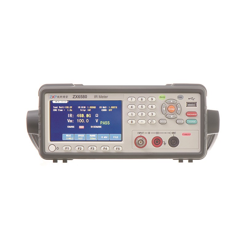ZX6580系列 绝缘电阻测试仪 概述 在不需要外部充电电源的情形下,ZX6580系列绝缘电阻测试仪内置1V-650V任意电压输出,满足大部分测试需求。七量程测试,绝缘电阻测量范围可达1kΩ-325GΩ,ZX6580A系列绝缘电阻测试仪内置1V-1000V任意电压输出,满足大部分测试需求。七量程测试,绝缘电阻测量范围可达1kΩ-10TΩ,高达55次/秒的采样速率,为自动化生产提供了优选测试解决方案。 ZX6580系列 绝缘电阻测试仪 产品特点 ● LCD彩色液晶显示 ● 中英文操作界面 ● 1nA~20mA的测量范围 ● 量程自动或手动 ● 清零功能 ● 针对容性材料的接触检查功能 ● SCPI指令,联机组建自动化系统更方便 ● 测试条件自动保存,支持U盘存取文件 ● 比较器功能,实现合格、不合格分选 ● 可用U盘升级仪器软件 订购信息 ● ZX6580 电压:1V-650V, IR/LC测试 ● ZX6580A 电压:1V-1000V, IR/LC测试 ZX6580系列 绝缘电阻测试仪 技术参数