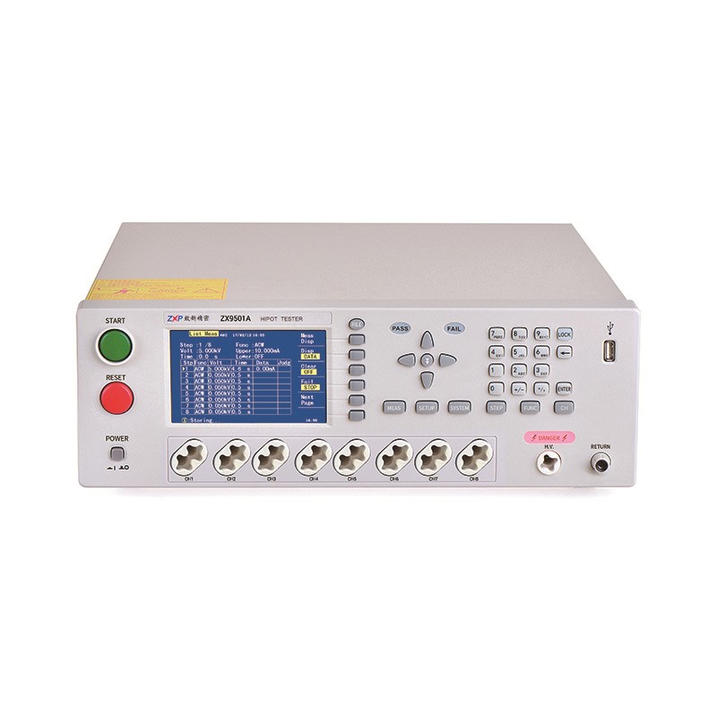 ZX9501SA系列 绝缘耐压测试仪(带接触检查) 概述 ZX9501SA系列绝缘耐压测试仪采用800*480彩色液晶显示屏,其输出电压的大小、输出电压的上升、测试、下降时间、输出电压的频率完全由MCU控制,能实时显示击穿电压的电流值和电压值,全系列仪器都具有电弧侦测功能和测试线接触检查功能。 ZX9501SA系列绝缘耐压测试仪独特的测试线接触检查功能,解决了用户”因测试线断线造成的不良品误判”的困扰,可广泛应用于耐压测试的半自动或自动化生产线上,大大提高产品测试的可靠性。 ZX9501SA系列 绝缘耐压测试仪(带接触检查) 产品特点 ● 中英文操作界面 ● 列表显示功能,多步结果一屏显示 ● 键盘锁功能,关机自动保存测试条件 ● 开短路侦测功能(OSC) ● 测试线接触检查功能 ● 不良品声光报警功能 ● 快速放电功能 ● 电弧侦测功能,电流、等级两种模式可选 ● 人体防触电保护功能(GFI) ● 任意设定电压上升时间、测试时间、下降时间 ● 支持U盘和内部文件保存 ● 电流底数清零功能 ● 可通过U盘更新仪器软件 订购信息 ● ZX9501SA-4:带4路扫描功能交直流绝缘耐压测试仪,带测试线接触检查功能。 ● ZX9501SA-8:带8路扫描功能交直流绝缘耐压测试仪,带测试线接触检查功能。 ● ZX9501SA-16:带16路扫描功能交直流绝缘耐压测试仪,带测试线接触检查功能。 性能特点触检查功能的测试应用举例 要测量一只电源变压器(DUT)的耐压性能,测量项目如下: (1)初级绕组P - 次级绕组S1、次级绕组S2:AC耐压测试 (2)初级绕组P、次级绕组S1、次级绕组S2 - 磁芯C:AC耐压测试 (3)要有测试线接触检查功能,防止测试线断线引起误判。 接线方法如下图所示:
