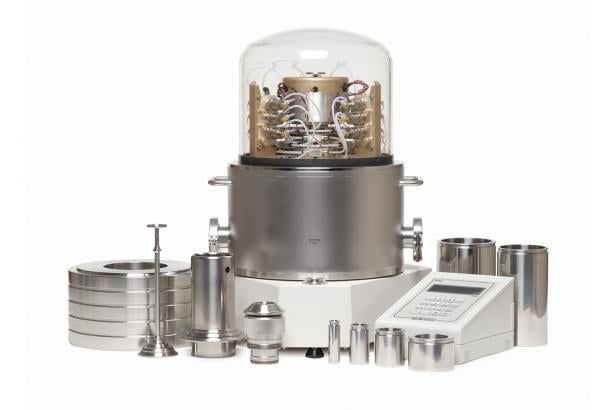 产品概述: PG7000-AMH 自动加码系统 AMH 技术 为了安装 AMH 砝码,在活塞顶上放置了一个二进制砝码加载盘,砝码盘上方安装了一个砝码驱动带。砝码组的主砝码放在砝码承重套上。管状的二进制砝码按递减顺序被放在砝码承重套的钓钩上,然后被置于砝码盘。 加码系统被放置在已安装砝码组的上方,并由 PG7000 平台通过 COM3 端口采用 RS232 通信进行控制。 为了加载特定的砝码值,加码系统会将活塞行程顶部的全部质量负载举升到砝码选择位置。砝码由一个气动的推举器抬起,该推举器作用于连接到二进制砝码推针的升降轴。三个选择器推针将每个未被加载的管状二进制砝码固定在原位。三个主砝码轴是同步旋转的,因此未被加载的主砝码会被固定沿保持在原位,而被加载的砝码则被释放在活塞上。完成砝码选择后,推举器向下移动,将升降轴、二进制砝码推针、承重套和所有释放的砝码置于活塞上。 AMH 加码系统的设计以及试验证明能够提供多年的可靠、免维护加码操作。 智能的加码控制 砝码加载系统的控制被集成到了 PG7000 的智能工作过程。在压力输入模式下,当通过前面板或远程输入目标压力命令后,PG7000 即计算达到目标压力所需的质量。然后通过向 AMH 发送命令停止活塞旋转,并加载砝码值。被加载砝码的真实值和达到的准确压力值均被报告并实时刷新。在质量输入模式下,所需的值是直接加载的。 AMH 加载的实际质量在其 100 g 的加载分辨率之内会尽可能接近目标值。如果指定了更精确的质量,则会提示操作员在微调砝码盘中加载微调砝码(在真空参考的绝压模式下不可用)。 灵活地操作活塞套筒模块 手动加码 PG7000 中所采用的活塞套筒模块也被用于 AMH 系统。活塞套筒模块可以在不到 5 分钟的时间内被拆除和重新安装,并且与单一手动加码校准序列下的工作量相当。 通过拆除 AMH 加码系统和砝码,即可操作活塞套筒模块。首先加载所有砝码在活塞上,使得自动加载系统不再有砝码。砝码自动加载系统被垂直地脱离 PG7000,仅留下完整的被加载砝码组。然后手动移除砝码,从而操作活塞套筒模块。 AMH-38,真空下 38 kg,适用于 PG7601 AMH-38 可以自动为 PG7601 活塞压力计平台加载一个 38 kg 的砝码。加码系统与真空室是一体的,如有需要,真空室可提供 KF40 的真空接头以连接涡轮分子真空泵和外部真空压力计。采用自动加码,便无需再将压力点间的真空分隔开,而且可以无期限地维持低至 0.01 Pa (< 0.1 mTorr) 的参考真空。 AMH-100,100 kg,适用于 PG7102、7202、7302 AMH-100 针对 PG7102、PG7202 和 PG7302 活塞式压力计平台提供 100 kg 砝码组的自动加码。 100 kg 的砝码组会在单个活塞套筒模块上产生较大的范围,这将更换活塞套筒模块的需要降至较小。如果所需砝码少于 100 kg,则可以配置少于 100 kg 的砝码组。 产品规格: PG7000-AMH 自动加码系统 技术指标