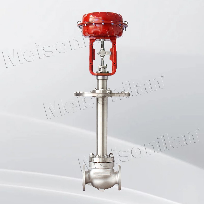 一、梅索尼兰MEISONILAN气动薄膜低温单座调节阀 概述 梅索尼兰气动薄膜低温调节阀/电子式电动低温调节阀,由单座阀体与气动、电子式或电动执行机构组成。 梅索尼兰气动薄膜低温调节阀是一种在低温、深冷场合使用的调节阀。采用长颈阀盖保温,配用多弹簧 执行结构,具有总体结构紧凑、重量轻、稳定性好等优点。阀体采用精密铸造角形结构,材料为铝合金,具有良好的耐低温性。波纹管密封保证了调节阀在低温场合不外漏。因而广泛应用于冶金、空分、制氧、石油、化工等低温、深冷场合。特别适用于精确控制低温气体、流体(如液氧、液氩等)的工艺参数保持在给定值。 本系列产品有连接板安装型、浮动套安装型两种。 低温深冷控制阀: 气动薄膜低温单座调节阀 气动低温紧急切断阀 气动低温切断球阀