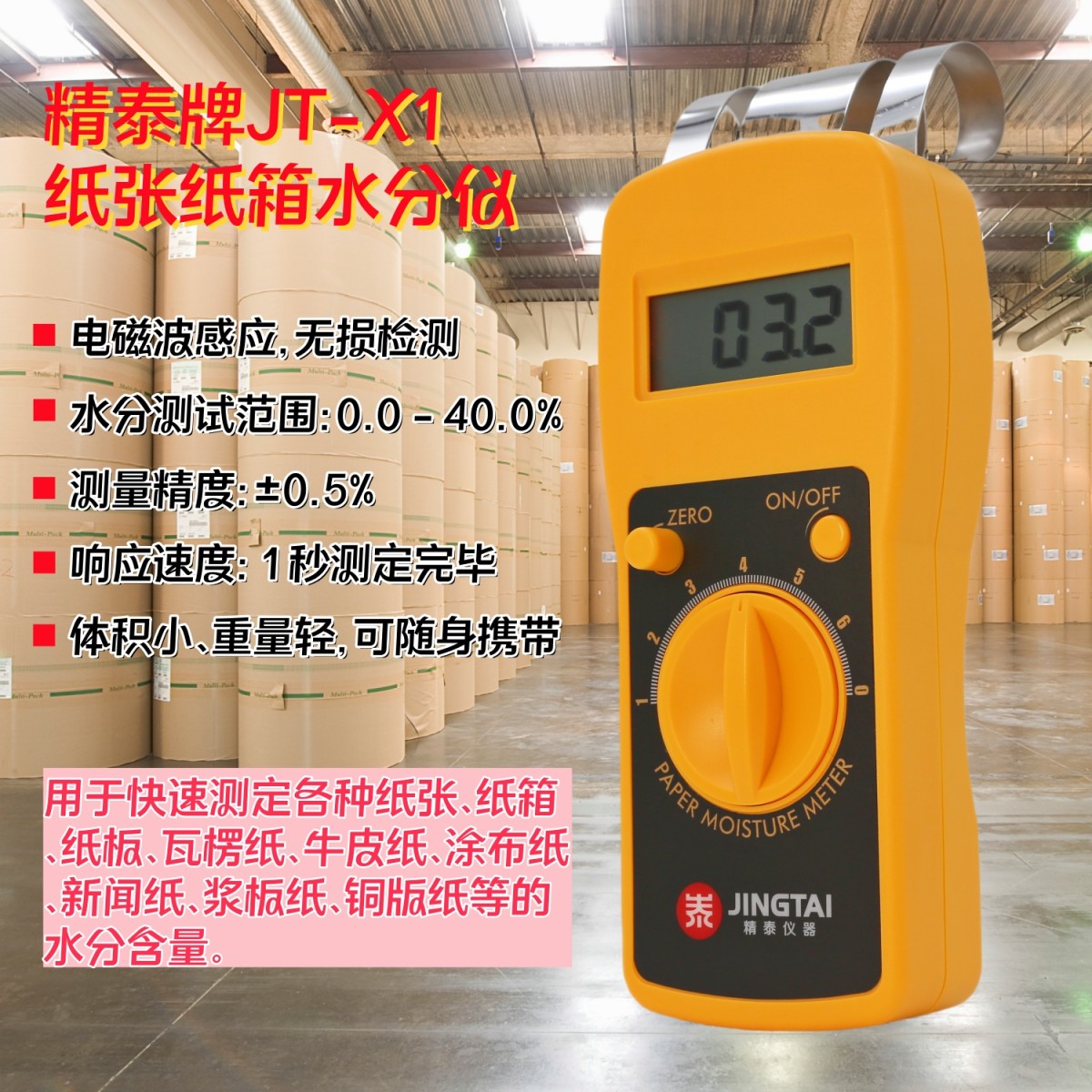 纸张快速水分仪(用于快速测定纸张、纸箱、纸板)供应商-精泰仪器,为您推荐一款新型常用的包装专用纸张纸板含水率检测仪:JT-X1纸张纸箱水分测试仪,该仪器是纸张纸箱水份检测理想工具。 JT-X1纸张纸箱水份检测仪是精泰仪器引进国外先进的电磁波感应技术在国内推出的高性能、无损检测、数字显示的水份检测仪器。仪器采用高周波原理,液晶屏幕显示,传感器与主体合为一体,设有六个档位用来检测各种纸张、纸板、瓦楞纸、纸箱、浆板纸、书写纸等的水份。该仪器测量水分范围宽、精度高、显示清晰、测量迅速、性能稳定、结果可靠,而且体积小、重量轻,可随身携带在现场进行快速检测,使用简单方便。JT-X1纸张纸箱水份检测仪是造纸、印刷、包装行业在生产过程中检验水份的理想仪器。 一、根据被测纸的不同选择档位。 1档:铜版纸、复印纸、传真纸 2档:新闻纸、白板纸、涂布板纸 3档:瓦楞纸、书写纸、牛皮纸、箱板纸 4档:50克以下纸张 5档:浆板纸 6档:纸箱、瓦楞纸板 三、测量:由于仪器采用电磁波扫描技术,其扫描深度为50mm。故测量时,纸张纸箱厚度应至少为50mm以上。打开开关(按下ON键),将探头压紧纸面,传感器圆头与纸面接触为一直线,且仪表与纸张保持平行;待数字稳定后,显示的数字即为被测物的水分值。 1、测量水分范围:0~40% 2、使用环境:-5℃~+60℃ 3、显示:3½位LCD液晶数字显示 4、精度:±0.5% 5、体积:160×60×27(mm) 6、响应时间:1秒 7、电源:9V(6F22型)积层电池一节 9、重量:200克 友情提示:JT-X1纸张快速水分仪采用电磁波感应原理,由于电磁波有较强的穿透性,因此,在测量时,被测物底部及周围不能有金属物质或磁性材料,否则金属物质或者磁性物质、导体半导体对电磁波会有很大的干扰,从而导致测量数据不准确。 |