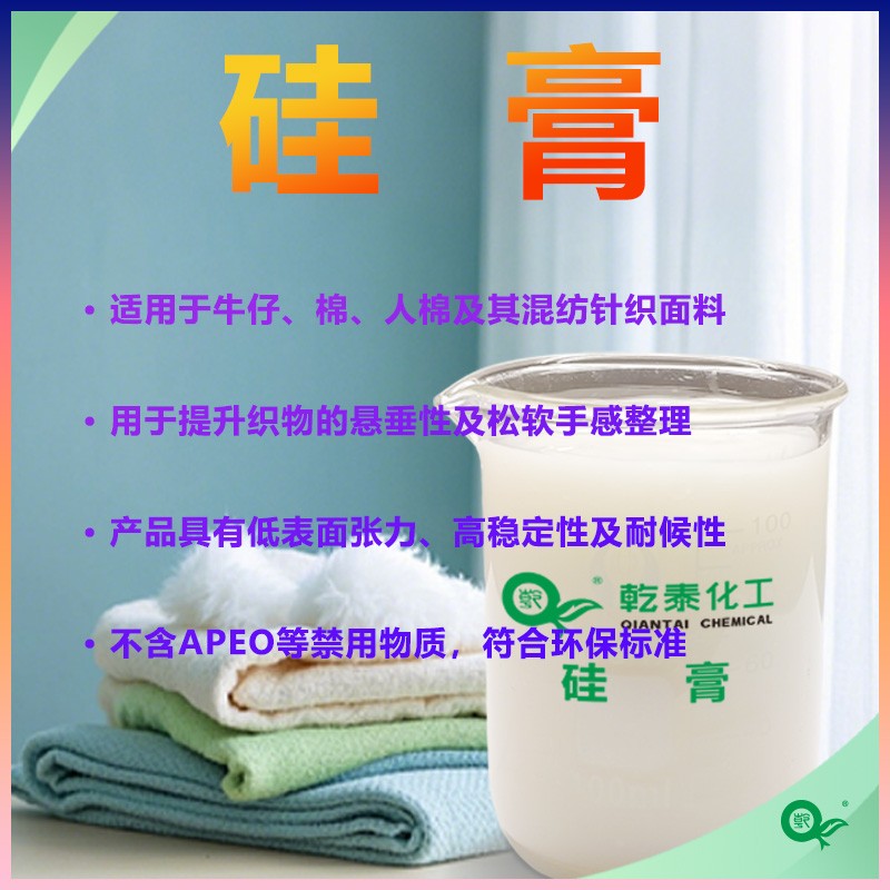 乾泰化工纺织硅膏QT-4332主要用于面料松软手感整理,赋予织物良好的弹性及悬垂性,其高效的表面成膜性以及优异的结合力让织物手感更舒适,满足不同的织物的手感整理需求。