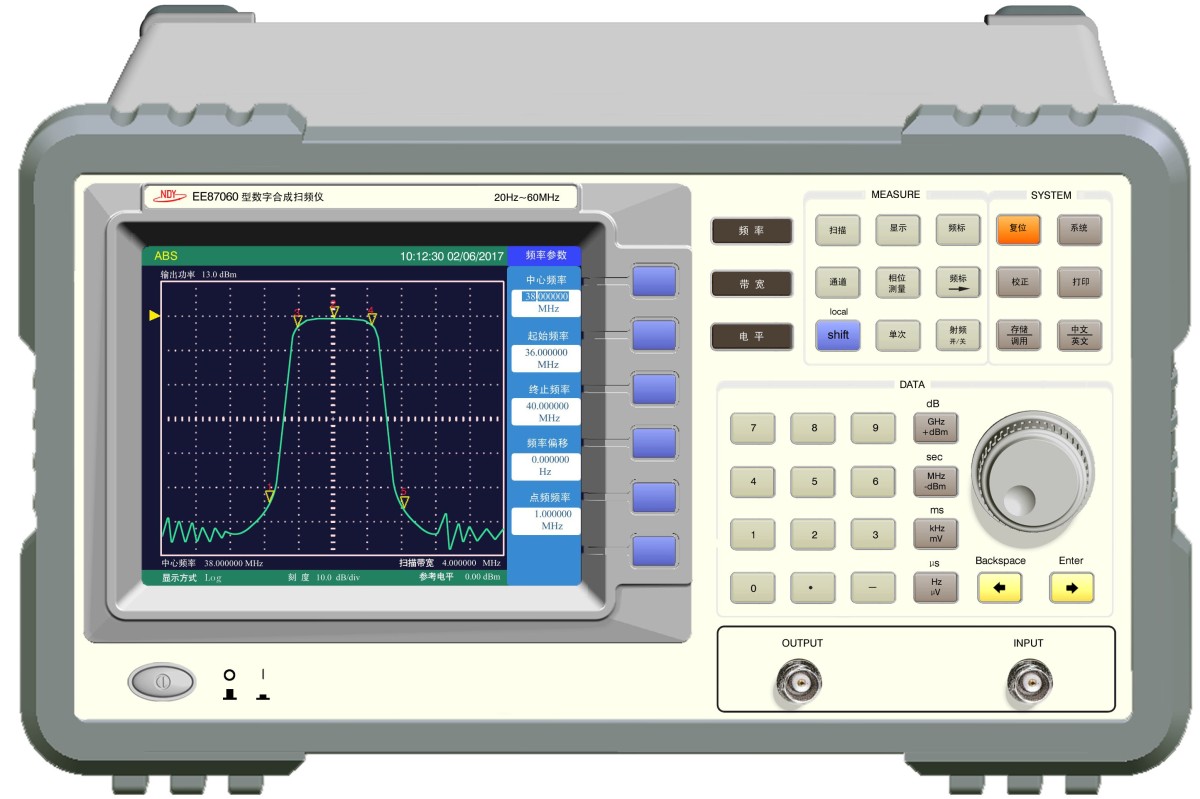 EE87060系列数字合成扫频仪采用直接数字合成技术,微处理器控制;内置检波器,无需检波探头;可完成20Hz~120MHz范围内任意一频率段的幅频特性的测量;扫频方式可任意设置,如线性、对数、点频等;可直接显示光标位置的频率值、幅度值。 6.4"TFT彩色液晶屏,视觉舒适,清晰度高;中文/英文菜单,操作方便;在扫频范围内可同时设置和显示五个光标;随机配置RS232接口,VGA(外接显示器)接口。可选配GPIB接口、USB接口,打印口。 产品特点: l 采用直接数字合成技术(DDS),输出频率精度、分辨率高 l 信号输出幅度范围+13dBm~-87dBm,电平平坦度±0.5dB l 内置检波器,无需检波探头可完成20Hz~60MHz范围内任意一频率段的幅频特性的测量 l 可直接显示光标位置的频率值、幅度值 l 6.4"TFT彩色液晶屏,视觉舒适,清晰度高 l 中文/英文菜单,操作方便 l 在扫频范围内可同时设置和显示五个光标 l 整机配置RS232接口、VGA接口。可选配GPIB接口、USB接口、打印口 l 采用嵌入式实时操作系统 l 工作状态存储、调用 l 波形曲线的存储、调用、分析 l 标记峰值自动搜寻 l 具有参考线的搜寻、设置和比较功能 l 具有-3dB带宽和Q值的测量 产品主要技术指标: