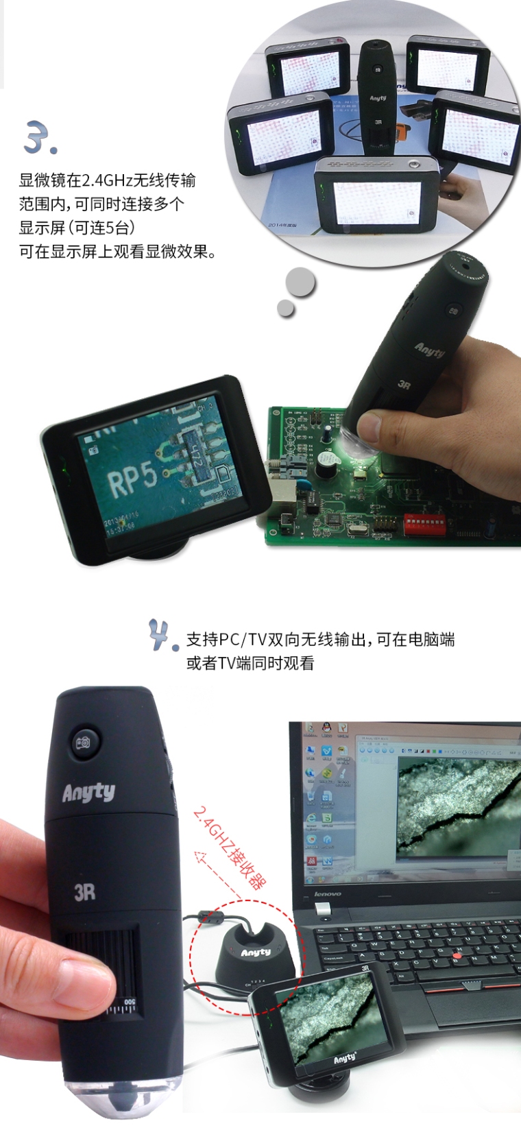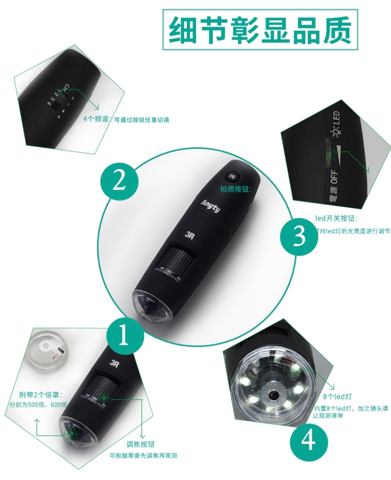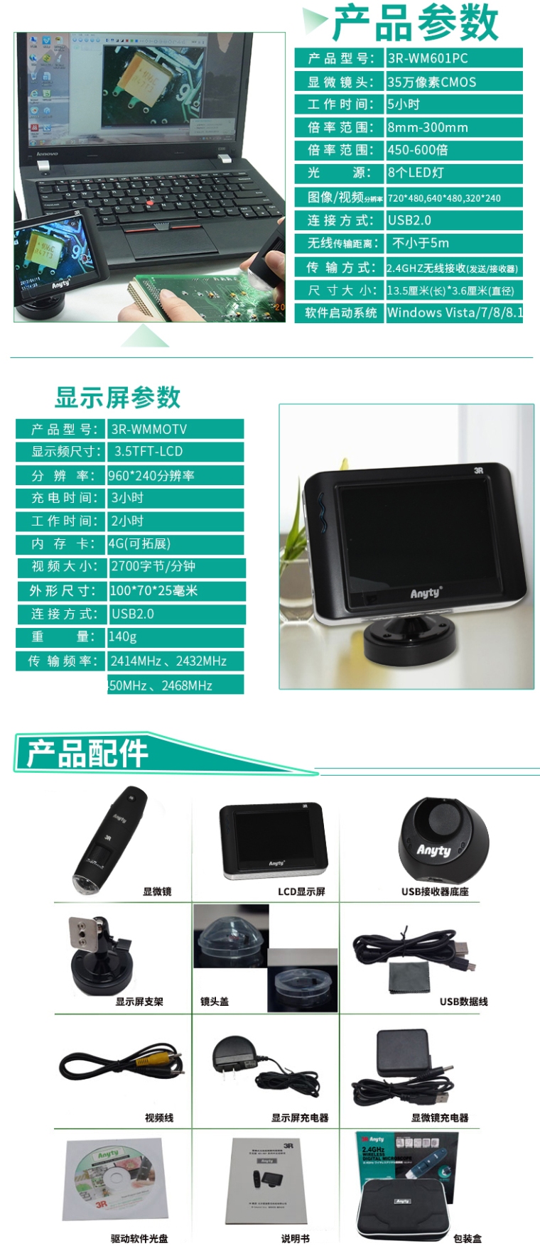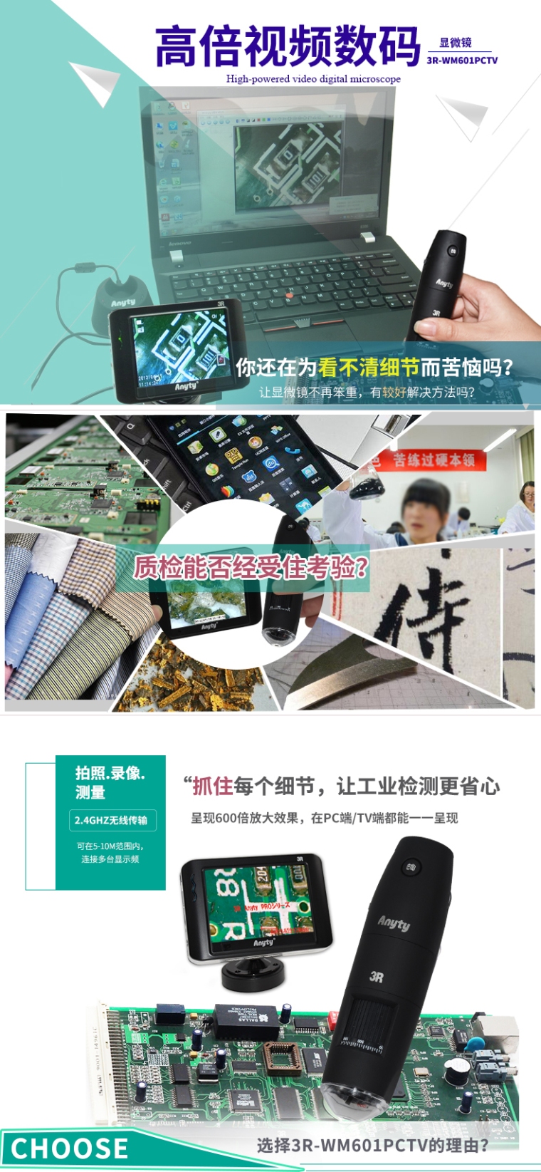 艾尼提3R-WM601PCTV数码显微镜以其精致便携的设计和出色的软件支持脱颖而出。具备一键式拍照和录像功能,支持面积测量、周长测算和定时拍照等特色功能。此外,它的无线传输配置不仅支持PC和TV的双向无线输出,还采用了人性化的调焦方式,使观察者能够突破时空限制,实现多线程观测和多重空间讨论,为传统显微镜带来了全新的体验。适用于广泛的应用领域,具有450-600倍的放大倍数,可满足不同观测需求。 3R-WM601PCTV精致小巧的便携设计,快捷方便的一键式拍照与录像,及强大的软件支持,面积测量、周长测算与定时拍照等特色功能,让使用者不断称奇;而无线传输的巧妙配置,不仅可同时支持PC/TV双向无线输出,让观测者突破了时空限制,且设计了人性化的调焦方式,不仅可完成工厂提出的相同空间“一起观察,一起谈论”,且可突破性的实现“多线程观测,多重空间的讨论”让传统显微相形逊色.