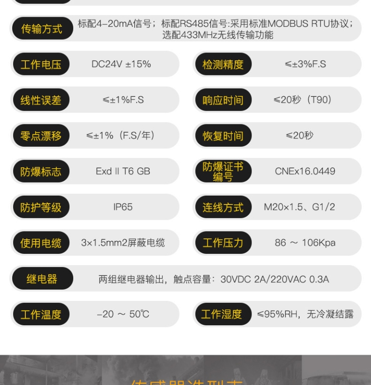 技术参数 型号 | K-G60(C2H4O) | 检测气体 | 乙醛C2H4O | 量程范围 | 0-100PPM | 可选量程 | 0-100PPM | 分辨率 | 1/0.1PPM | 报警点 | 低:20PPM 高:50PPM | 传感器 | 支持电化学、催化燃烧、半导体、PID光离子、红外气体传感器 | 安装方式 | 壁挂式、管道式(螺纹尺寸:M35X1.5mm)、流通式、泵吸式可选 | 传输方式 | 标配4-20mA;标配RS485型号:采用标准MODBUS RTU协议:选配433MHz无线传输功能 | 工作电压 | DC24V±15% | 检测精度 | ≤±3%F.S | 线性误差 | ≤±1%F.S | 响应时间 | ≤20秒 | 零点漂移 | ≤±1%(F.S/年) | 恢复时间 | ≤20秒 | 防爆标志 | Exd II T6 GB | 防爆证书编号 | CNEx16.0449 | 防护等级 | IP65 | 连线方式 | M20x1.5、G1/2 | 使用电缆 | 3X1.5mm2屏蔽电缆 | 工作压力 | 86~106Kpa | 继电器 | 两组继电器输出,触点容器:30VDC 2A/220VAC 0.3A | 工作温度 | -20~50℃ | 工作湿度 | ≤95%RH,无冷凝结露 |