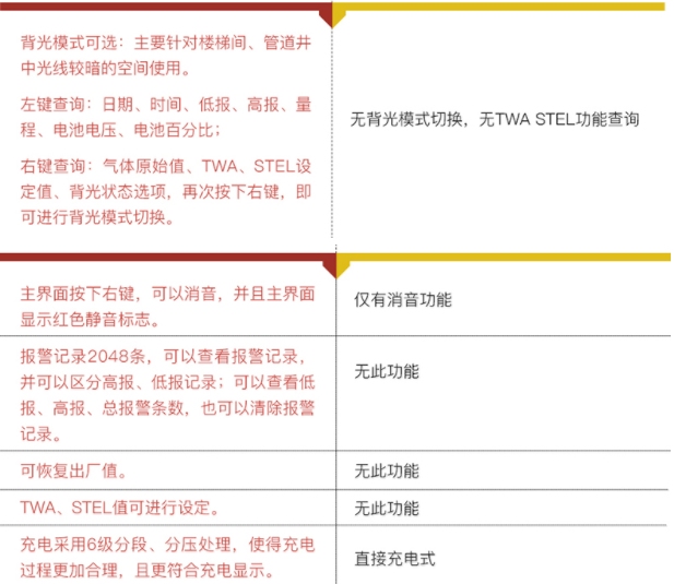 气体参数表 | 被测气体 | 测量范围 | 可选量程 | 分辨率 | 报警点 | | 可燃气体EX | 0-100%lel | 0-100%vol(红外) | 1%lel/1%vol | 低:20 高:50 | | 氧气O2 | 0-30%vol | 0-30%vol | 0.1%vol | 低:19.5% 高:23.5%vol | | 硫化氢H2S | 0-100ppm | 0-50/200/1000ppm | 1ppm | 低:10 高:20 ppm | | 一氧化碳CO | 0-1000ppm | 0-500/2000/5000ppm | 1ppm | 低:50 高:150 ppm | | 二氧化碳CO2 | 0-5000ppm | 0-1%/5%/10%vol(红外) | 1ppm/0.1%vol | 低:1000 高:2000 ppm | | 一氧化氮NO | 0-250ppm | 0-500/1000ppm | 1ppm | 低:50 高:150 ppm | | 二氧化氮NO2 | 0-20ppm | 0-50/1000ppm | 0.1ppm | 低:5 高:10 ppm | | 二氧化硫SO2 | 0-20ppm | 0-50/1000ppm | 0.1/1ppm | 低:5 高:10 ppm | | 氯气CL2 | 0-20ppm | 0-100/1000ppm | 0.1ppm | 低:5 高:10 ppm | | 氢气H2 | 0-1000ppm | 0-500/2000/5000ppm | 1ppm | 低:50 高:150 ppm | | 氨气NH3 | 0-100ppm | 0-50/500/1000ppm | 0.1/1ppm | 低:20 高:50 ppm | | 磷化氢PH3 | 0-20ppm | 0-20/1000ppm | 0.1ppm | 低:5 高:10 ppm | | 氯化氢HCL | 0-20ppm | 0-20/500/1000ppm | 0.1ppm | 低:5 高:10 ppm | | 二氧化氯CLO2 | 0-50ppm | 0-10/100ppm | 0.1ppm | 低:5 高:10 ppm | | 氰化氢HCN | 0-50ppm | 0-100ppm | 0.1/0.01ppm | 低:10 高:20 ppm | | 环氧乙烷C2H4O | 0-100ppm | 0-100ppm | 1/0.1ppm | 低:20 高:50 ppm | | 臭氧 | 0-10ppm | 0-20/100ppm | 0.1ppm | 低:2 高:5 ppm | | 甲醛CH2O | 0-20ppm | 0-50/100ppm | 1/0.1ppm | 低:5 高:10 ppm | | 氟化氢HF | 0-100ppm | 0-1/10/50/100ppm | 0.01/0.1ppm | 低:2 高:5 ppm | | 二甲苯/甲苯 | 0-20ppm | 0-1/10/50/100ppm | 0.01/0.1ppm | 低:5 高:10 ppm |