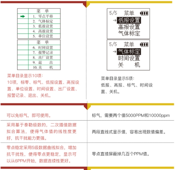 气体参数表 | 被测气体 | 测量范围 | 可选量程 | 分辨率 | 报警点 | | 可燃气体EX | 0-100%lel | 0-100%vol(红外) | 1%lel/1%vol | 低:20 高:50 | | 氧气O2 | 0-30%vol | 0-30%vol | 0.1%vol | 低:19.5% 高:23.5%vol | | 硫化氢H2S | 0-100ppm | 0-50/200/1000ppm | 1ppm | 低:10 高:20 ppm | | 一氧化碳CO | 0-1000ppm | 0-500/2000/5000ppm | 1ppm | 低:50 高:150 ppm | | 二氧化碳CO2 | 0-5000ppm | 0-1%/5%/10%vol(红外) | 1ppm/0.1%vol | 低:1000 高:2000 ppm | | 一氧化氮NO | 0-250ppm | 0-500/1000ppm | 1ppm | 低:50 高:150 ppm | | 二氧化氮NO2 | 0-20ppm | 0-50/1000ppm | 0.1ppm | 低:5 高:10 ppm | | 二氧化硫SO2 | 0-20ppm | 0-50/1000ppm | 0.1/1ppm | 低:5 高:10 ppm | | 氯气CL2 | 0-20ppm | 0-100/1000ppm | 0.1ppm | 低:5 高:10 ppm | | 氢气H2 | 0-1000ppm | 0-500/2000/5000ppm | 1ppm | 低:50 高:150 ppm | | 氨气NH3 | 0-100ppm | 0-50/500/1000ppm | 0.1/1ppm | 低:20 高:50 ppm | | 磷化氢PH3 | 0-20ppm | 0-20/1000ppm | 0.1ppm | 低:5 高:10 ppm | | 氯化氢HCL | 0-20ppm | 0-20/500/1000ppm | 0.1ppm | 低:5 高:10 ppm | | 二氧化氯CLO2 | 0-50ppm | 0-10/100ppm | 0.1ppm | 低:5 高:10 ppm | | 氰化氢HCN | 0-50ppm | 0-100ppm | 0.1/0.01ppm | 低:10 高:20 ppm | | 环氧乙烷C2H4O | 0-100ppm | 0-100ppm | 1/0.1ppm | 低:20 高:50 ppm | | 臭氧 | 0-10ppm | 0-20/100ppm | 0.1ppm | 低:2 高:5 ppm | | 甲醛CH2O | 0-20ppm | 0-50/100ppm | 1/0.1ppm | 低:5 高:10 ppm | | 氟化氢HF | 0-100ppm | 0-1/10/50/100ppm | 0.01/0.1ppm | 低:2 高:5 ppm | | 二甲苯/甲苯 | 0-20ppm | 0-1/10/50/100ppm | 0.01/0.1ppm | 低:5 高:10 ppm |