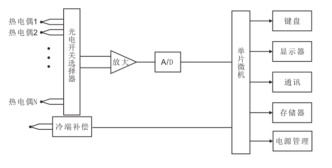 如图所示,仪器由热电偶、光电开关选择器、放大器、A/D、单片微机、键盘、显示器、通讯、数据存储器、电源管理、冷端补偿等部分组成。 由光电开关选择器选择对应应的通道信号,经过信号放大器进行信号放大,再经过AD转换器进行模拟信号转换成数据信号到单片微机进行数据处理,由冷端补偿电路进行常温测量,得到冷端温度值,测量信号与冷端温度值经单片微机进行数据处理,最后得出正确的测量温度值在显示屏上显示出来。 键盘、通讯、数据存储器可对数据在显示屏.上进行设置、存储加以分析,还可以通过通讯接口连接电脑直接由电脑进行数据分析。电源管理包括电池和充电电路。 按键功能