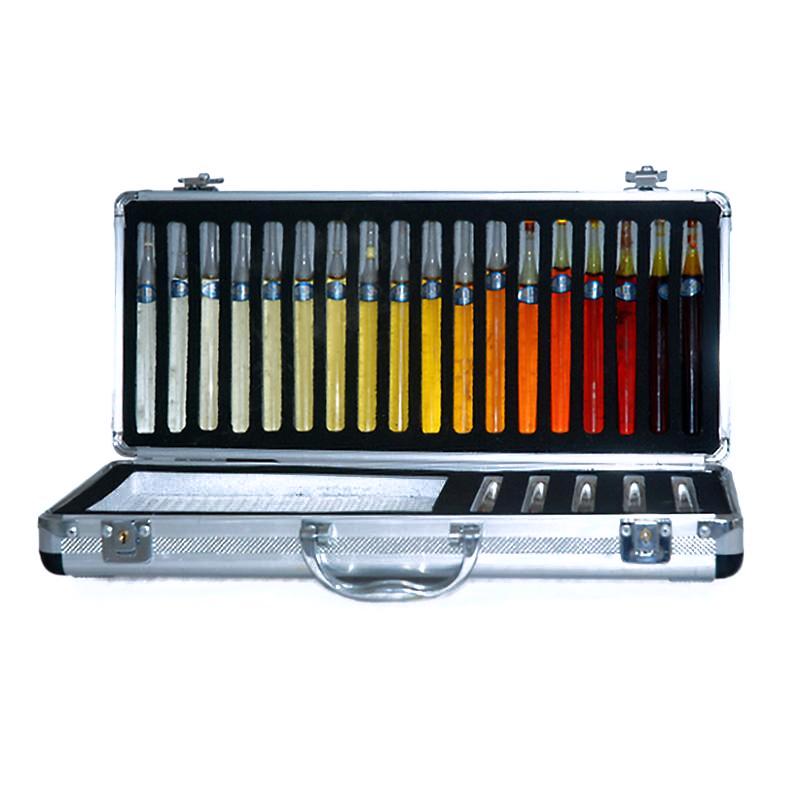 在标准光源箱内,选择试样颜色与铁估比色计18个色阶中较接近的两种,并以确认与某一颜色相同的色阶号表示。