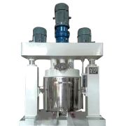 设备简介 高粘度 三轴 高低速真空搅拌混合机 釜内有三根不同形式的搅拌器,其中一根低速搅拌器在绕釜体轴线转动,其余两根高速搅拌装置又以不同的转速绕自身轴线高速自转,使物料在釜内作复杂的运动,受到强烈的剪切和混合。设备内山形刮壁刀绕釜体轴线转动,将粘在壁上和底部的原料刮出参与混合,使其效果更为称心。设备密封性好,可电加热(水冷却)抽真空,具有良好的排气除泡效果。分散机缸盖可液压升降,缸体可自由移动,操作十分方便。分散机搅拌器的形式,根据物料要求可为多层桨叶式、框式、蝴蝶式、叶轮式等。 1.搅拌机是一种效率高、多功能、强制性搅拌机,他通常采用机架、缸盖和搅拌桨叶升降,而料缸移动的模式。 2.搅拌机由三个电机组成,中间的电机通过减速机驱动“山”字型刮边刮底机构,边上两个高速电机直连高速分散盘,高速电机通常配置变频器调速,以满足各种产品的工艺要求。 3.搅拌机通常采用加厚钢板和特殊密封结构,以适应抽真空和加压等场合。 4.搅拌机通常可以配置多个可移动料缸,该料缸通常设计成夹套结构,以实现加热或冷却。 5.搅拌机通常配套系列液压挤出机,以实现膏状物料的挤出。 机械密封和釜体之间的(梯形)软密封,使物料可在真空下操作; 设备釜盖可液压升降,缸体可自由移动,操作十分方便,在面对高粘度物料生产时,将为您定制配套的液压挤出机,只需要移动料缸到挤出机那,进行挤出出料即可,操作方便,效率高。 设备特点 1.釜体采用独特的密封,使物料可在真空下混合、搅拌,完全排除气泡。 2.釜体可电加热、蒸气加热及油水循环加热。夹套内盘管可实现冷却。中间的框式搅拌带有刮壁轴,在搅拌的同时还能刮壁。使物料达到更好的混合效果。 3.釜体内壁为大型立车精加工确保活动刮刀在旋转时把釜体内壁及釜底的物料完全刮 掉。 4.釜内两组高速分散轴的分散器,使各种物料受到强列的剪切与分散混合,效果是普通 混合机的几倍。 5.釜内的高速分散器采用变频调速,可根据不同工艺、不同粘度选择不同速。 应用范围 生产能力:1-5000L 应用领域:多组份固-固液,固-液相,液-液相物料的混合,反应,分散,溶解,调质等工艺,如粘胶剂,密封胶,模具胶、硅酮密封胶、有机硅胶、聚氨酯密封胶、厌氧胶、封闭胶、软膏,电子浆料、锂离子电池浆液、粘合剂、颜料、油墨、药膏糊状物料,润滑脂,油漆,膏状化妆品,添加物等多种高粘稠物的制备,实验室搅拌机只作实验小批量试行生产用。 高低速混合分散 搅拌机系列参数对比