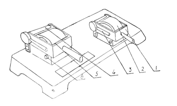 结构示意图 1、压架 2、托膜(R25;R50两种) 3、压紧辊柄 4、偏心轴 5、滚心轴 6、定位肖 技术参数
