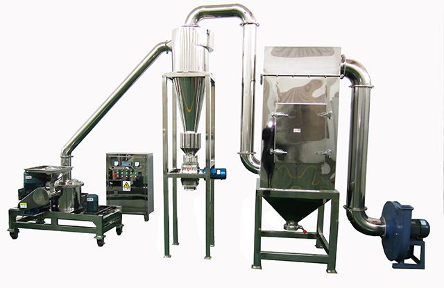 该机由主机、辅机、电控箱三个部分组成,具有风选式、无筛、无网、粒度大小均匀等多种性能,生产过程连续进行。物料由料斗经螺旋输送器进入粉碎室,被高速旋转的刀片剪切粉碎,通过负压风运的方法把物料运入旋风分离器、袋式除尘器,粉碎刀盘与分级轮转速采用变频控制,产品粒径可通过调节粉碎刀盘及分级轮转速来控制,排出的物料达到产品粒度要求。