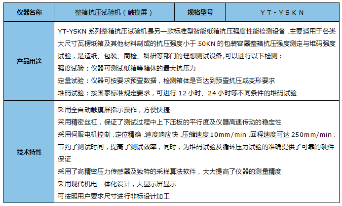 YT-YSKN系列整箱抗压试验机是另一款标准型智能纸箱抗压强度性能检测设备,主要适用于各类大尺寸瓦楞纸箱及其他材料制成的抗压强度小于50KN的包装容器整箱抗压强度测定与堆码强度试验,是造纸、包装、商检、科研等部门的称心测试设备。