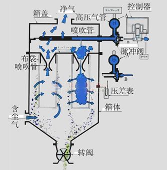 (2)喷吹系统:包括主气管、喷吹管、脉冲阀、控制仪。