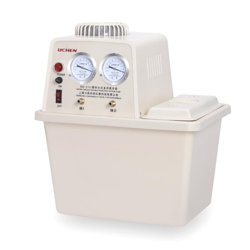 产品简述 本产品是以循环水作为工作流体,利用射流产生负压原理而设计的一种新型多用真空泵,为化学实验室提供真空条件,并能向反应装置提供循环冷却水。广泛用于蒸发、蒸馏、结晶、减压、升华等作业,是大专院校、 化工、食品加工等领域实验室的称心设备。 产品特点 ◇ 循环水式真空泵采用双抽头,可单独或并联使用 ◇ 核心电机部分为不锈钢电机轴芯,长期工作不生锈 ◇ 涡轮涵道式结构,保证水流最大量快速地通过 ◇ 特制流体消声器,减少水中的气体与液体的磨擦噪音 ◇ 全铜线圈交流电机,尾部自带散热风扇,可连续工作 ◇ 抽气管路上装有止回阀,可防止抽真空作业时意外停机 系列选型