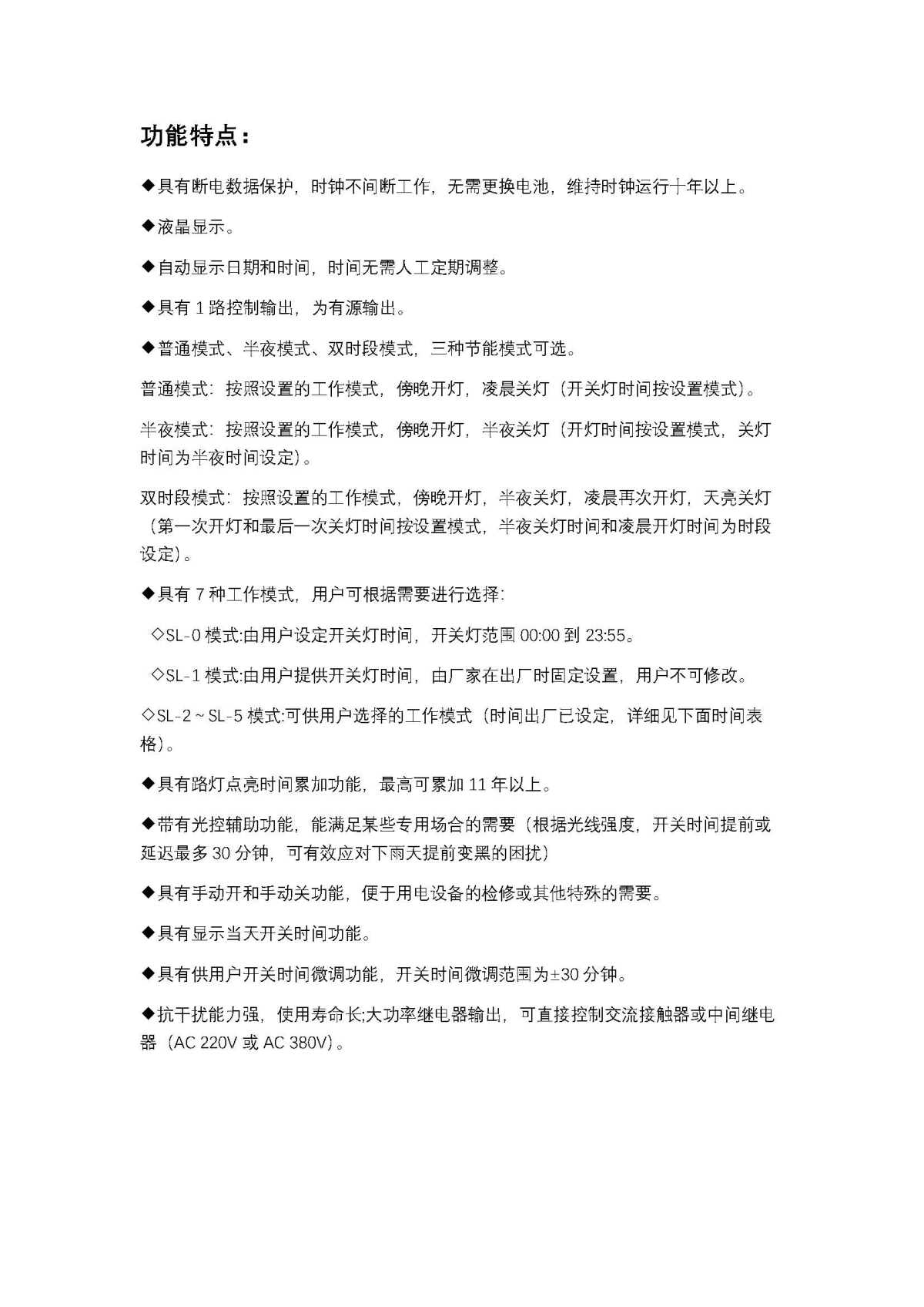 SL-601系列智能型路灯自动控制器采用国外先进的微处理器,可靠性高、误差小、稳定性强。电路设计及程序编制均全面考虑我国地理和气象条件、日出日落的关系、四季的变化规律等诸多因素, 预置了多种合理且实用的参数,并可根据用户需要设定多种功能及修改参数,运用微处理器精确控制时间。并且有半夜控制功能,能适应不同地理环境的需要;是路灯、航标信号灯、霓虹灯、广告灯箱等设备的**时间控制器;可广泛应用于街道、铁路、车站、航道、工矿、学校及供电部门等一切需要时间控制的场所。