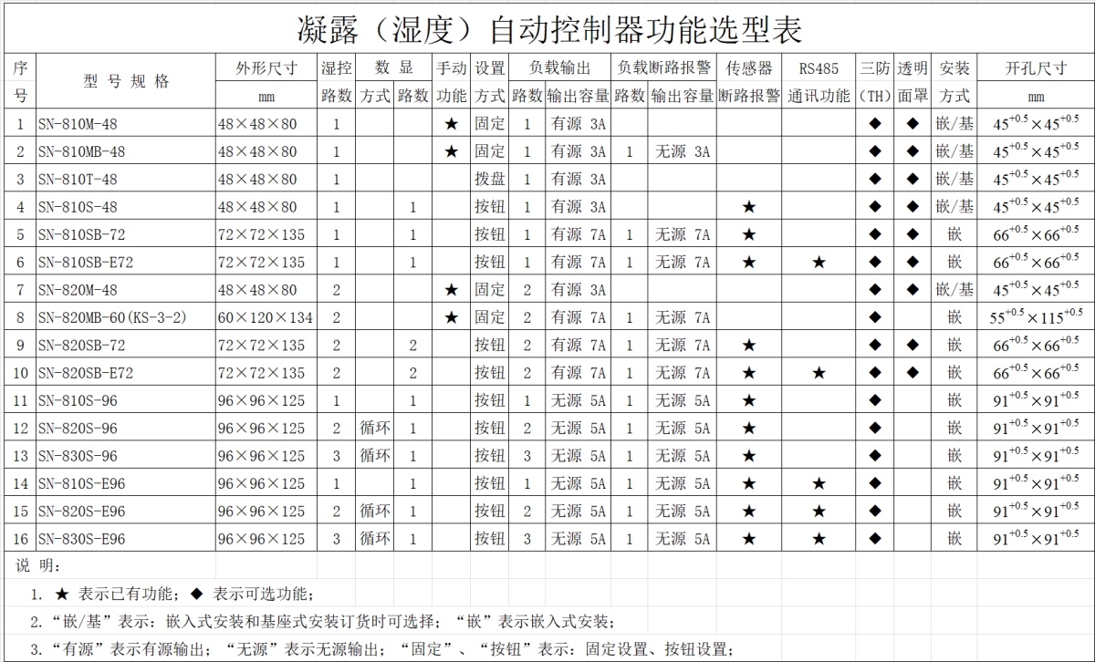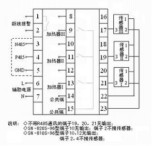 有三路湿度控制。可同时对三个独立被测环境的湿度进行实时精密监控。使环境湿度指标符合工作要求,并可以有效地防止凝露产生。用数字显示湿度的设定值或测量值;用户通过按钮自行设定湿度控制值。能对除湿装置的断路故障自动报警;同时具有传感器断路报警并自动切断负载的功能,有效防止由于传感器断路造成负载失控长期运行; □技术参数: ◆供电电压: AC / DC 85~265V ◆测量控制范围: 湿度0~100%RH 显示精度 ±0.1%RH 检测精度:±3%RH (10%RH~99%RH) ◆参数设置: 控制值:全量程0~100% 回差: 湿度1~40%RH 传感器误差修正: 湿度0~100%RH ◆显示方式:三位LED数码管显示,1位小数 ◆除湿控制:启动:湿度≥设定湿度 停止:湿度≤设定湿度-湿度回差 ◆功率消耗: ≤ 5W ◆负载继电器输出容量:AC220V / 7A(阻性负载时)三路 ◆报警继电器触头容量:AC220V / 7A(阻性负载时)一路 ◆外形尺寸: 控制器 96ⅹ96ⅹ125mm 传感器 75×80×28.5mm □安装方式: 嵌入式安装:在安装面板上开91+0.5ⅹ91+0.5mm孔,用安装支架将控制器固定在面板上。 □接线图: |