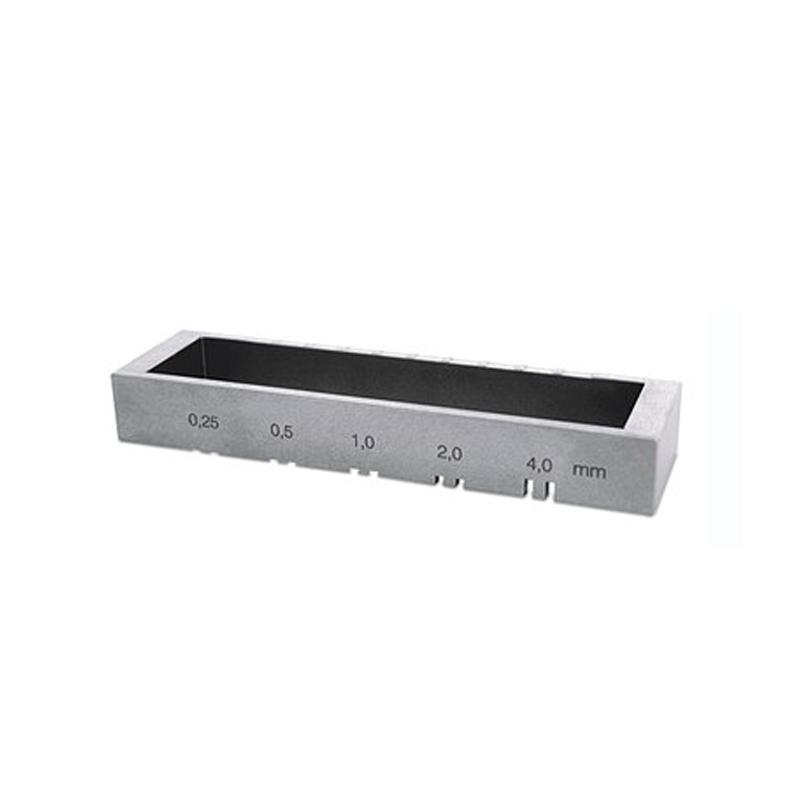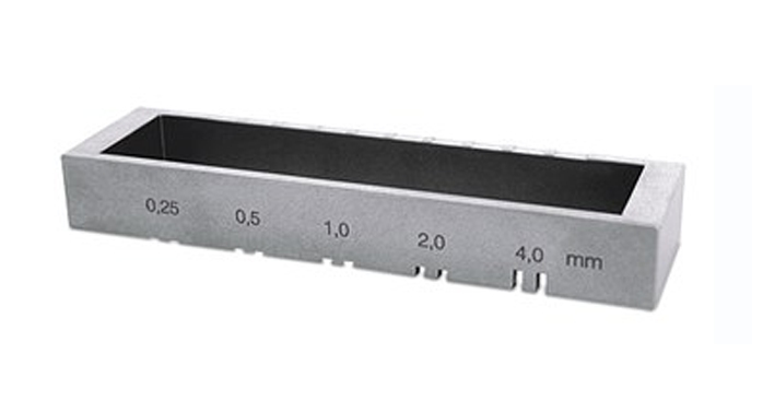 仪力信erichsen419流平流挂试验仪测试原理: 用一个不锈钢制的带不同高度槽的特殊油漆涂膜器在基材上涂上平行的湿膜条。 流挂性能通过一个垂直的流动测试来决定,流平性能通过一块水平样板决定,样板在涂层固化后可通过目测检查。 419型流平流挂试验仪的功能: 涂膜器框架两侧切割有小槽 -用于流平试验的拉拖边有5对槽,(图1b)每个槽的宽度、两个槽的距离和每对槽间的距离已预设好 -每对槽的高度按倍数等级分级,从250 mm到4 mm。 -用于流挂试验的拉拖边有10个槽,(图1a) 以25 mm增长级,从75 mm增长到300 mm。 流平试验符合ASTM D 28011)标准 使用流平试验拉拖边在指定基材上拖出湿膜条。当样品在水平位置硬化后,两条互相浸透的漆膜数量将确定。 设 计 涂膜器的4条边共有24个槽(图2),如419型-ASTM标准,槽的宽度和槽间的距离已预设好。槽的高度由75 mm到1300 mm不等。 垂直流挂试验符合DIN 55 677标准。 湿膜条涂在一块标准的钢制样板上。涂膜后样板垂直放置(湿膜条在样板上流动,最薄的一条在最上端)。涂料允许干燥,一个适当的测厚仪用于测量没有因流挂作用而破坏的最厚涂层的厚度,该层将作为垂直流动性的流动指数。