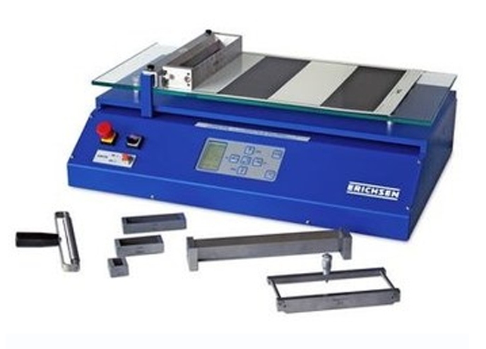 erichsen510MC技术指标: ● 涂布行程最大达400mm。 ● 极细分的涂膜速度: 0.1 – 19.9 (以0.1 mm/s 调整)/ 20 - 100 (以 1 mm/s 调整) mm/s., 可将试纸夹于玻璃平板上或另购真空吸盘, 真空吸盘可加加热平台。 ● 可更换的工作平面有: 玻璃平板, 沟槽式真空吸盘, 孔洞式真空吸盘, 以及专业的薄膜专用真空吸盘。 ● 加热平台可控温度为室温到最高140C, 调整间隔0.1C。 ● 干燥时程纪录之速度为: 0.1 – 19.9 / 20 - 108 min/cm.(最久3天) ● 内建破真空套件。 可选配件