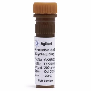 生物制药 HPLC 分析->N-糖样品前处理和分析->用于 N-糖分析的多聚糖标准品和文库 AdvanceBio 2-AB 人 IgG N-糖文库. 由与正常人 IgG 上的 N-糖一致的复合二天线型寡糖组成。利用荧光染料 2-AB(2-氨基苯甲酰胺)对还原末端进行衍生化。