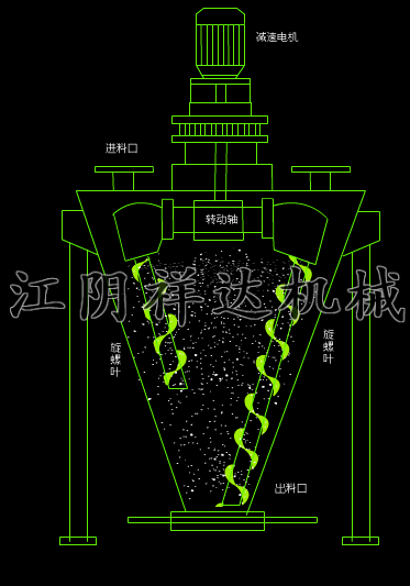 双螺旋锥形混合机的公转而使粉体沿着锥体壁作圆周运动。螺旋叶片的自转,使粉体向锥体中央排放作径向运动。粉体自锥体向上升流及螺旋外圆周表面上排出,即螺旋轴方向混合。螺旋在混合机内公转,自转的组合,造成了粉体的四种流动形式,也就是对流,剪切,扩散,渗合的复合运动。因此粉体物料在这种混合机内能迅速达到均匀的混合。