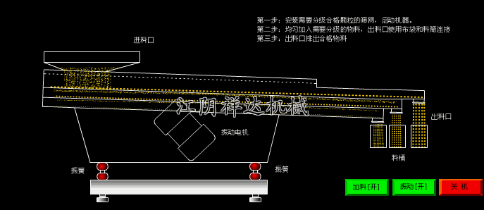 本机由筛箱、振动源及减震器三大部分组成。振动机架与筛箱连接有4-12组软橡胶减震器上下固定,产生离心力,由震器控制浮动振幅,使物料有一个向下抛震和向下分层过滤的过程,从而达到**分级过筛的效果。