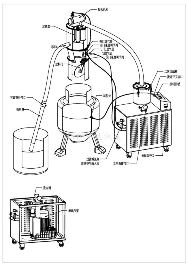 一、工作原理 真空加料机是利用电动真空泵作为真空源的一种真空输送机,利用该真空加料机可以将物料从容器中直接送入混合机、反应器、料斗、压片机、包装机、振动筛、整粒机、湿法制粒机、干法制粒机和粉碎机中去。该机减轻了工人的劳动强度,杜绝了粉尘污染,保证生产符合“GMP”要求。 ZKS系列真空加料机是用旋涡气泵抽气,使吸料嘴进口处及整个系统处于一定的负压状态,粉粒料随同外界空气被吸入料嘴,形成料气流,经过吸料管到达料斗,在料斗中进行气、料分离。分离后的物料进入受料设备。送料——放料是通过气动换向阀不断地开、闭来完成的,而气动换向阀的开闭是由控制中心来控制的。 真空加料机中装有压缩空气反吹装置,每次放料时,压缩空气脉冲反吹过滤器,把吸附于过滤器表面的粉末打落下来,以保证吸料能正常运行。 对料位控制的真空加料机,受料设备的料斗中物料通过料位计完成自动加料。当受料设备的料斗高于某一位置时,真空加料机停止动作进入待机状态;当料位低于某一位置时,真空加料机自动启动,完成对受料设备的加料。 真空加料机技术参数