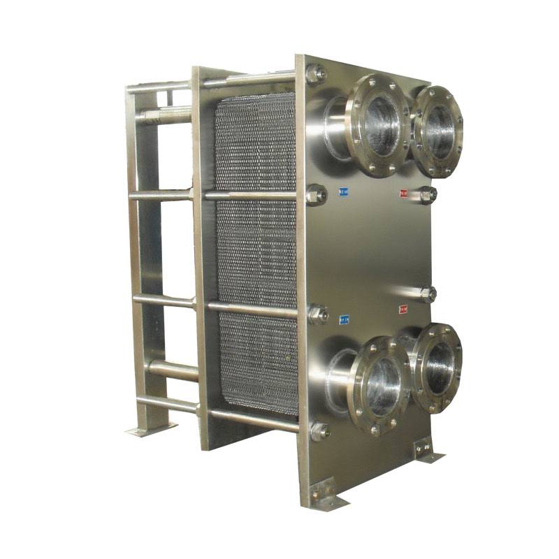1、概述 板式换热器是近几十年来得到发展和广泛应用的一种新型高效、紧凑的热交换器,它由一系列互相平行、具有波纹表面的薄金属板相叠然后用夹板、螺栓紧固装配的一种换热器。冷热两种工作流体相间在每两块相邻板片组成的狭小而曲折的通道中流过,并通过间隔冷热流体的板片进行冷热交换。 板式换热器主要由传热板片、密封胶垫、压紧装置等组成。板式换热器的结构及换热原理决定了其具有结构紧凑、占地面积小、传热系数高、操作灵活性大、应用范围广、热损失小、安装和清洗方便等特点。两种介质的平均温差可以小至1℃,热回收效率可达到99%以上。在相同压力损失情况下,板式换热器的传热系数是列管式换热器的3~5倍,占地面积为其的1/3,金属耗量只有其的2/3.因此板式换热器是一种高效、节能、节约材料、节约投资的先进换热设备。目前已广泛用于化工、石化、食品、机械、集中供热、冶金、动力、船舶、造纸、纺织、医药、核工业和海水淡化及热电联产等工业领域,可满足各类冷却、加热、冷凝、浓缩、消毒和余热回收等工艺的要求,在换热器领域已成为一种极有竞争能力的品种,甚至在某些工业领域已取代了传统的管壳式换热器。随着它的发展,应用领域将越来越广。 2、材料选择 2.1 板片和垫片 板片及胶垫材料的选用,主要看冷热交换介质的腐蚀性和温度而定。本公司制造的板式换热器板片材料及使用场合列在表一、垫片材料及使用场合列在表二,供用户参考选用。 表一 板片材料