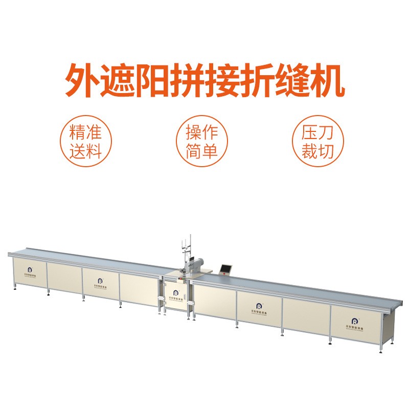 该机用于遮阳面料缝制,通过更换不同的拉筒模具实现拼接,折边缝纫功能,机头采用三同步送布机械,吃厚及送布能力强,送料平稳,带红外感应系统,可自动倒针,自动剪线,采用大型旋梭,线芯容量大,减少换底线次数。台面采用输送带,前后各4M,自动输送布料,该机普通学徒即可操作,车缝线迹标准美观,大大提高生产效率。