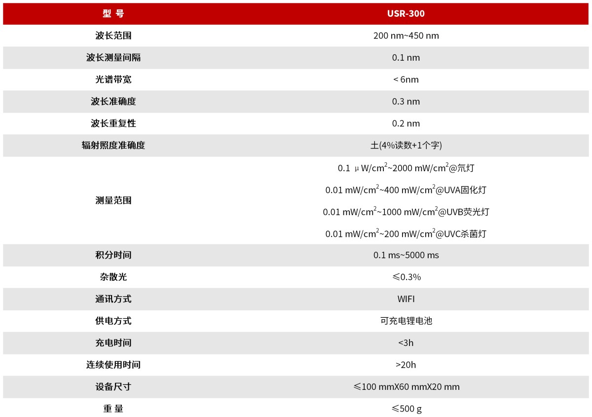 典型应用场景 USR-300采用特有的“即时读屏测量(Reading while Measuring, RWM)”技术,集光谱测量、位姿感知和智慧显示于一体, 结构紧凑,人性化设计,特别适用现场快捷测量,精密余弦校正和消杂光技术,更添专业风范,此设备广泛应用于紫外光源的消毒杀菌、光照治疗、老化、探伤、光刻、光固化、育种、植物栽培等领域的测量
