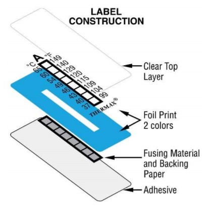 标签是如何工作的: 温度敏感元件是使用明确定义的相变指示器。 一系列特殊纯化有机化学品的熔点赋予独特、高精度、变色效果。每个温度元件使用不同的化合物。 并通过将含有化学物质的涂层应用于特殊的吸收剂而分开制造。 纸基片。当超过额定温度时,化学熔化并被吸收。 基板,造成长久性颜色变化。多达十个元素可以组合在一起。 在单一标签上。 技术参数