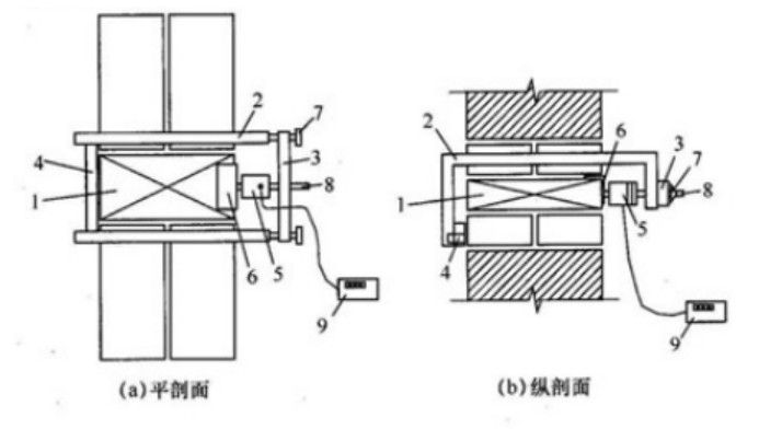 1-被推出丁转;2-支架;3-前梁;4-后梁;5-液压缸;6-垫板;7-调平螺钉 9-推出力峰值测定仪