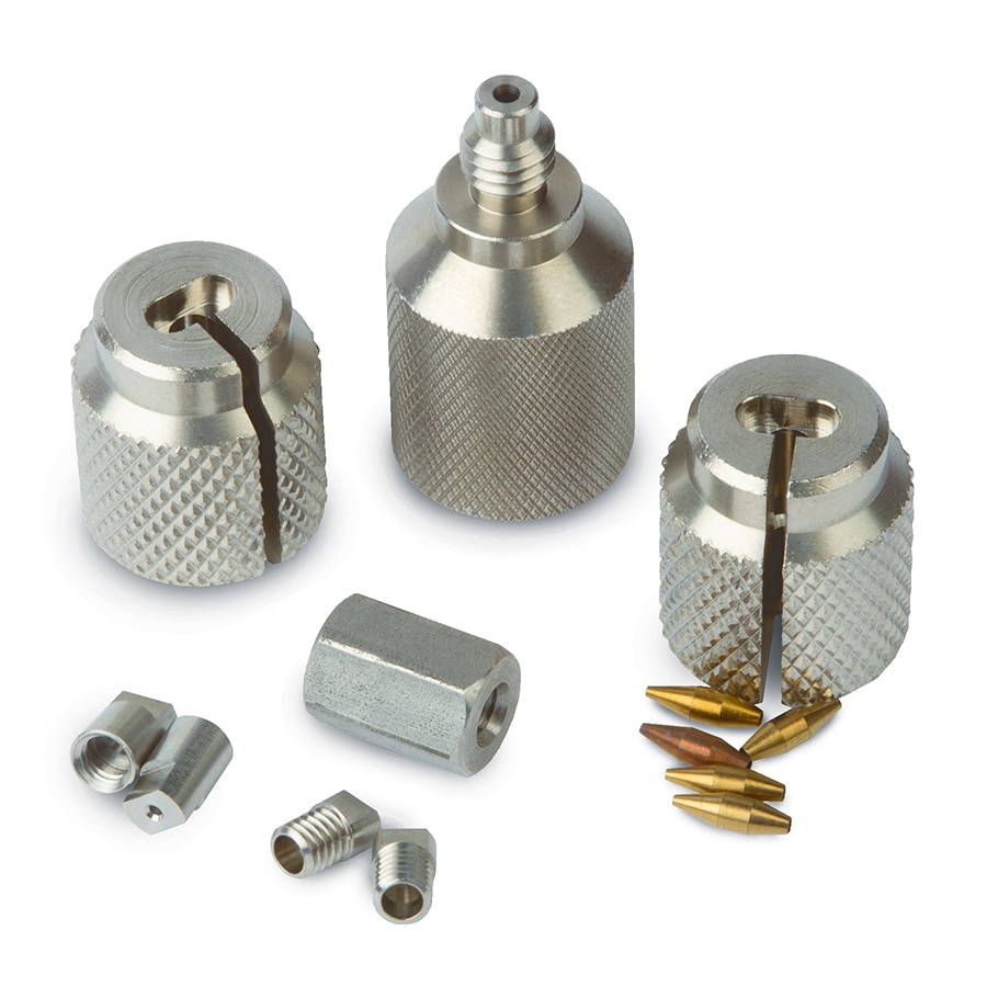 压接式连接器在许多情况下表现良好,但在极端温度和压力循环下,连接器密封可能会受损。在这种情况下,SilTite 微型两通是更佳的选择,因为它们能够**连接分析柱、保护柱和保留间隙。SilTite FingerTite 技术提供了便捷的安装方式和可靠的无泄漏连接。通过使用这些连接器,数据质量可以得到改善,因为它们的零死体积设计和去活性金属结构可确保***峰形。坚固的 SilTite微型两通适用于质谱工作以及任何存在极端温度和压力变化的应用。连接器套件提供六种配置,用于安全连接内径相同或不同的柱。每个套件包括两个 SilTite 微型两通连接器、五个双锥形卡套和安装工具。 连接不同内径(ID)的柱时,应先连接内径较大的柱。由于卡套较小,很难区分两个卡套孔径的大小差异,因此很容易将内径较小的柱安装到错误的孔径中。由于较大的柱(例如0.32毫米)无法适应较小的卡套孔径(例如0.25毫米),因此先安装较大的柱可以确保两根柱都使用正确的卡套端。 特点与优势